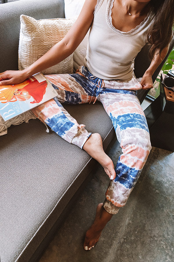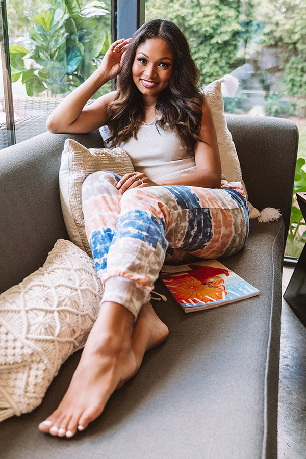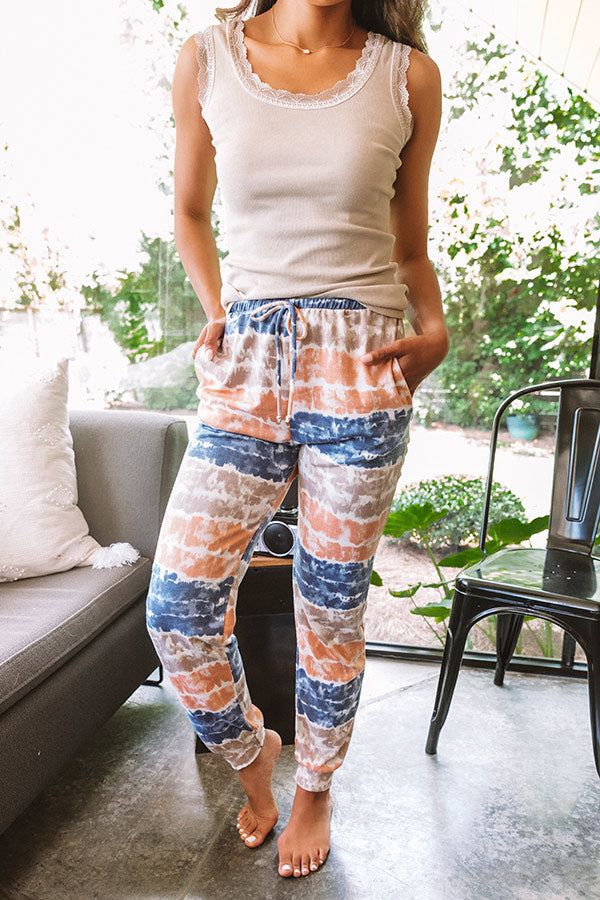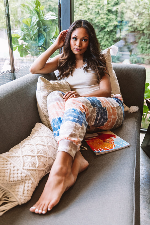 Lounge around in style with our adorable "Here And There" joggers featuring soft lightweight material patterned with horizontal blue, coral, and neutral hued tie dye stripes, an elastic waistline with a tie belt, accent side pockets, and a relaxed pants silhouette that falls into fitted ankle-length hemlines! We have styled this comfy piece with a matching tank, but you can also wear it with our long sleeve "No Drama Ribbed Bodysuit in White," our white "Flake Slip On Sneaker," sunnies, and "The Essential Faux Leather Backpack in Grey!"