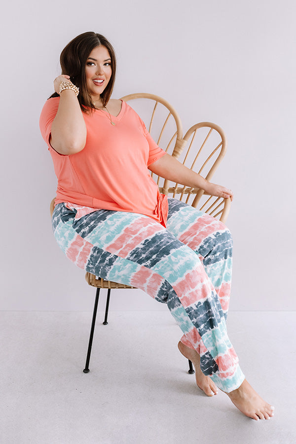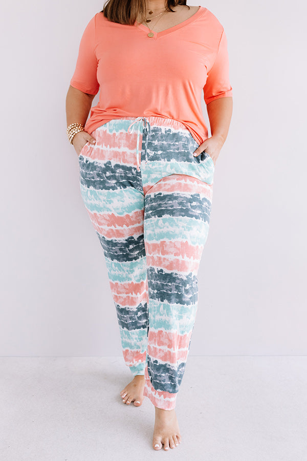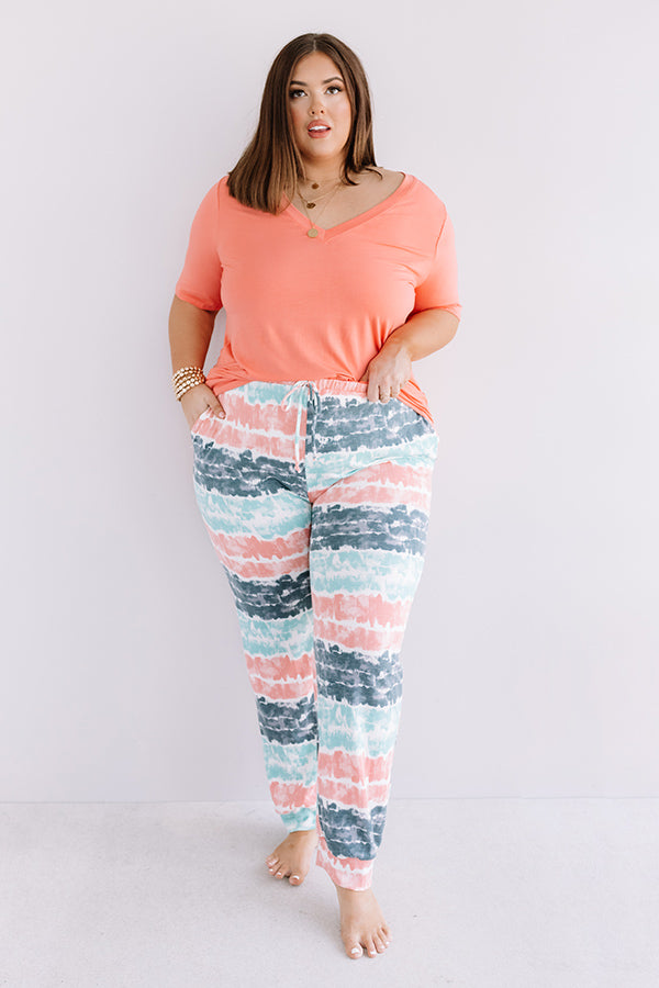 Plus Size - Lounge around in style with our adorable "Here And There" joggers featuring soft lightweight material patterned with horizontal blue, coral, and ocean wave hued tie dye stripes, an elastic waistline with a tie belt, accent side pockets, and a relaxed pants silhouette that falls into fitted ankle-length hemlines! We have styled this comfy piece with a matching tee, but you can also wear it with our long sleeve "No Drama Ribbed Bodysuit in White," our white "Flake Slip On Sneaker," a faux leather backpack, and the "Rockefeller Views Sunnies in Charcoal!"