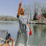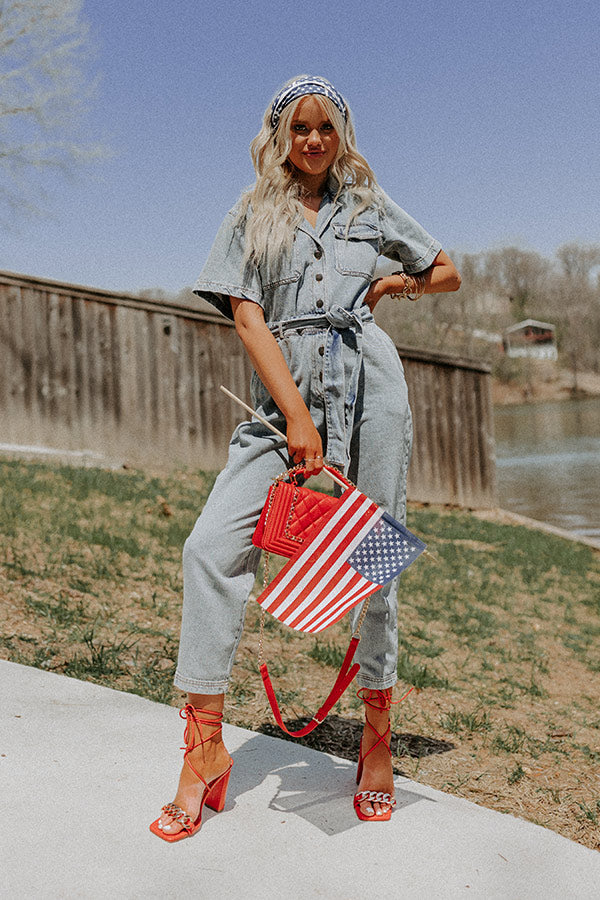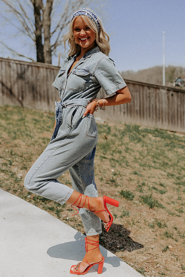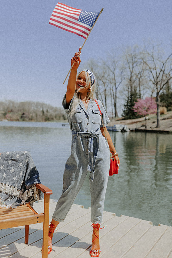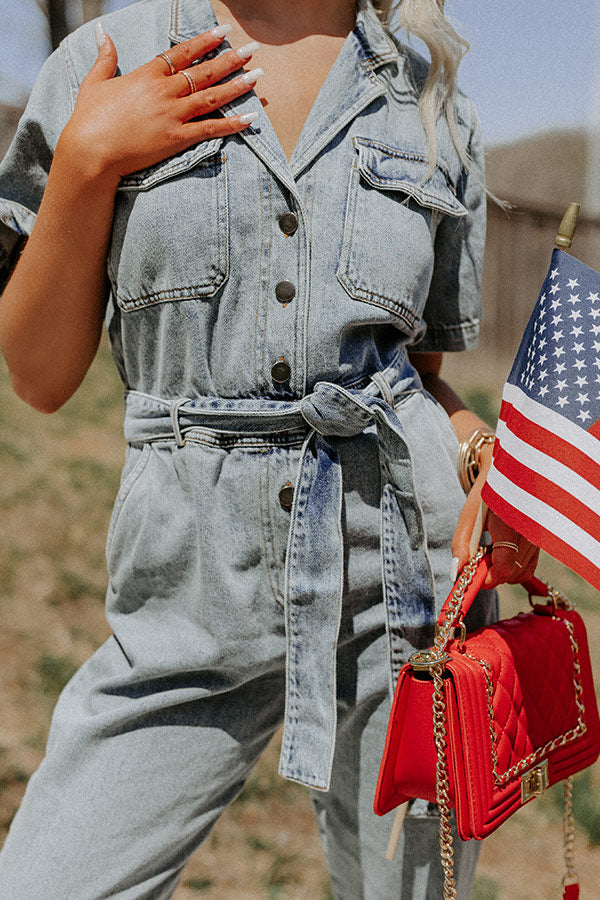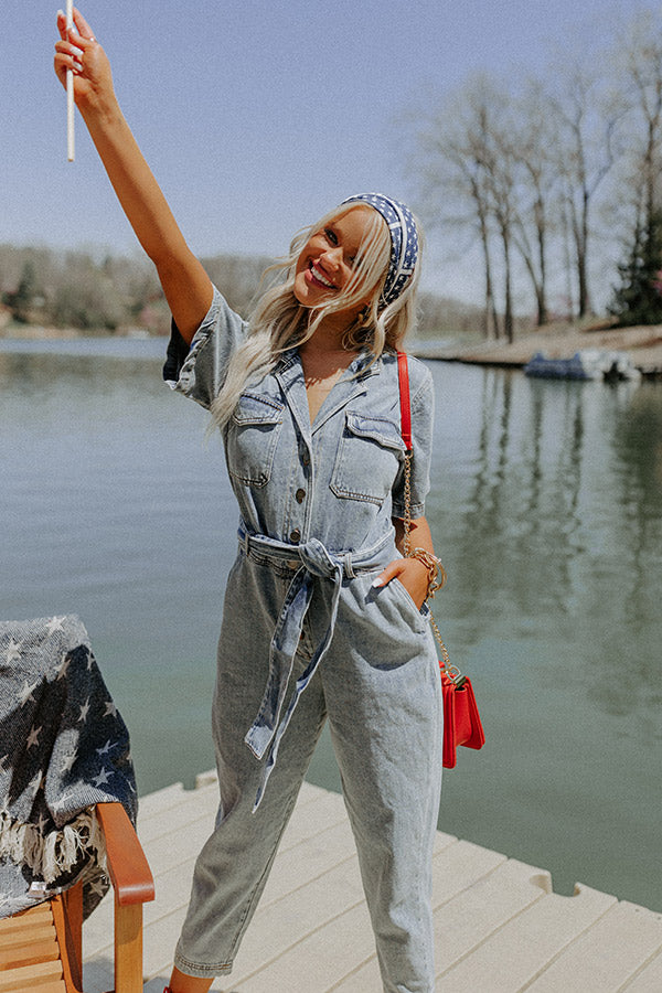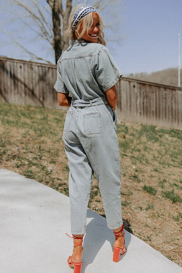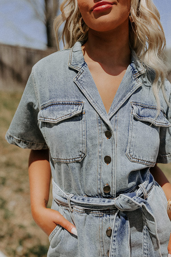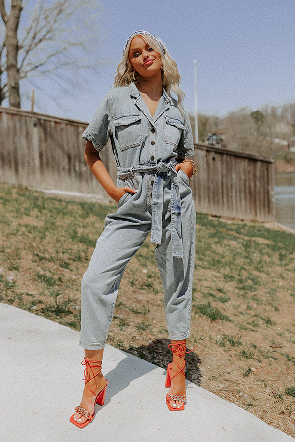 Make a fashionable statement in our unique 'Here We Go' jumpsuit featuring lightweight light wash denim material, a button up front with a collared neckline, short loose sleeves, two accent chest pockets with flap closures, two side pockets, and two back pockets, a matching tie belt, and a flattering silhouette that ends in straight mid-calf length hemlines! on products