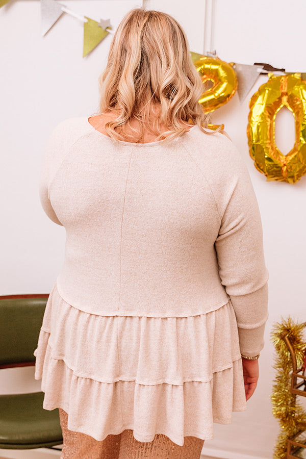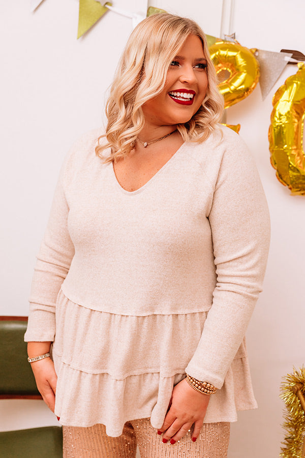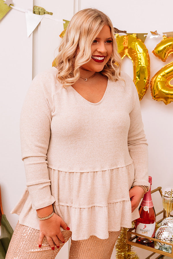 Plus Size - Keep you New Year' Eve style casual with our darling birch colored 'Hey Day Shift Top' featuring lightweight flowy material, a v-cut neckline, long sleeves, and flattering silhouette that falls into a tiered peplum silhouette that falls into an uneven mid-thigh length hemline! Measurements