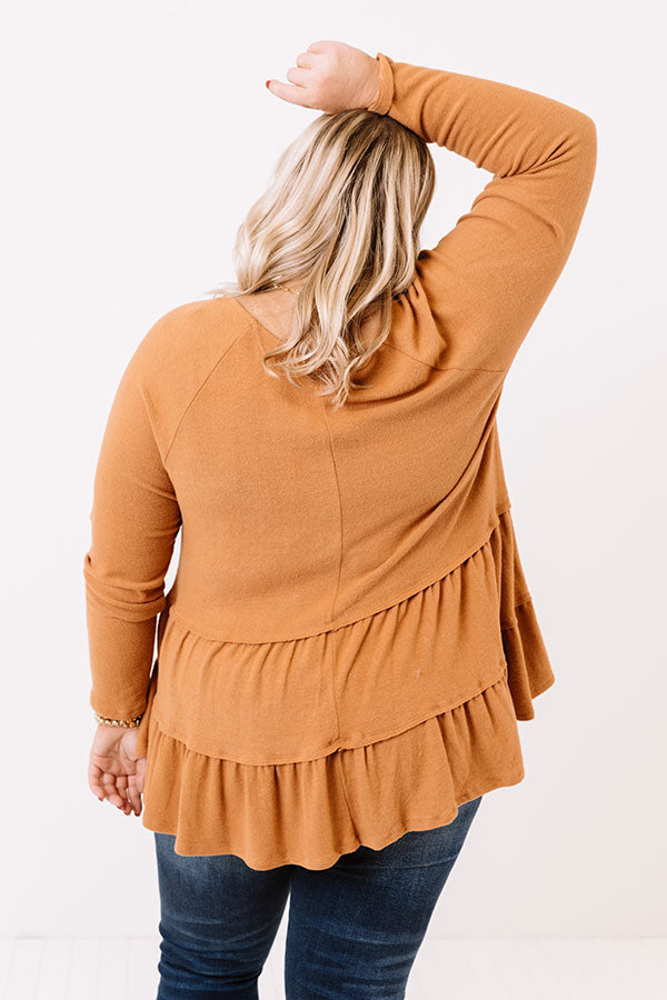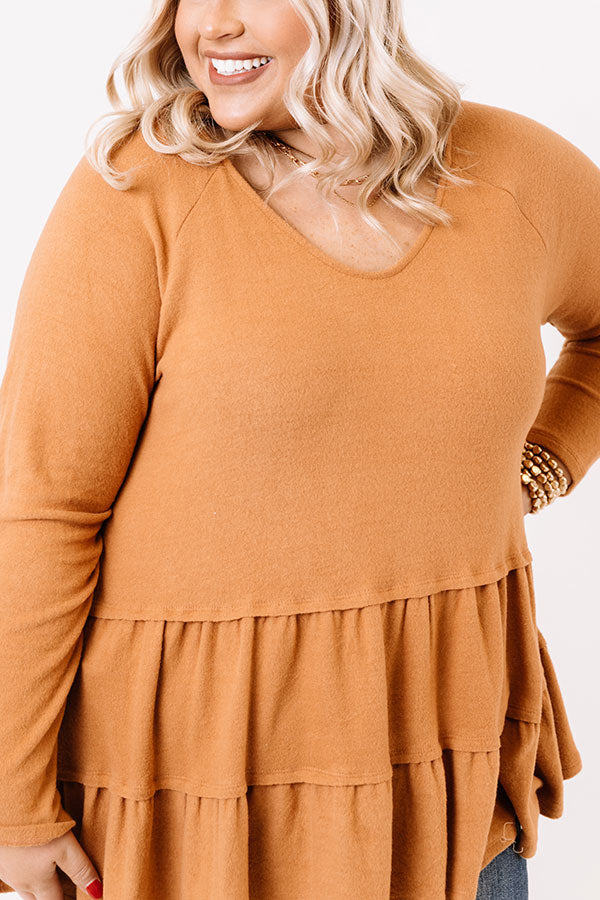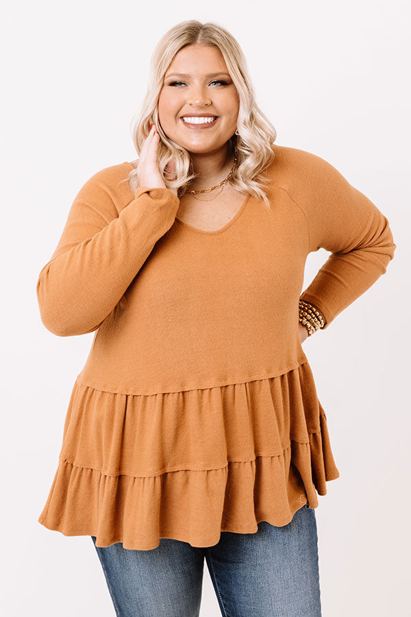 Plus Size - Keep you New Year' Eve style casual with our darling camel colored 'Hey Day Shift Top' featuring lightweight flowy material, a v-cut neckline, long sleeves, and flattering silhouette that falls into a tiered peplum silhouette that falls into an uneven mid-thigh length hemline!