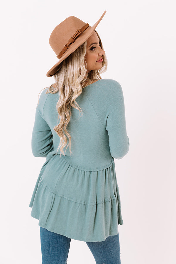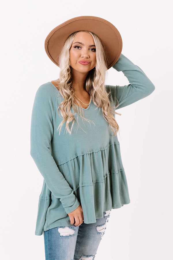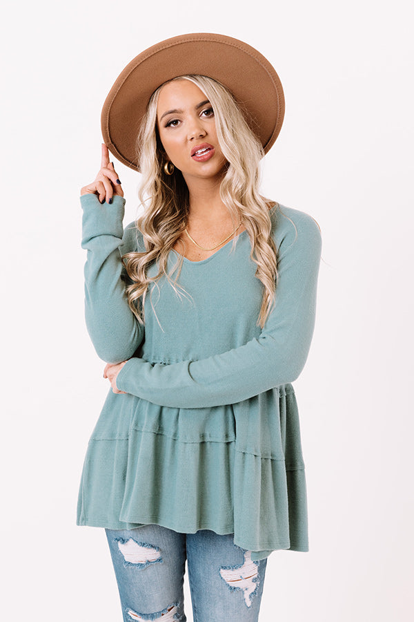 Keep you New Year' Eve style casual with our darling light teal colored 'Hey Day Shift Top' featuring lightweight flowy material, a v-cut neckline, long sleeves, and flattering silhouette that falls into a tiered peplum silhouette that falls into an uneven mid-thigh length hemline! Measurements