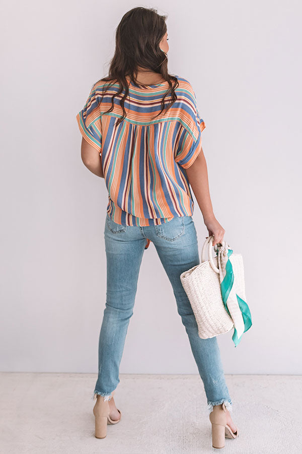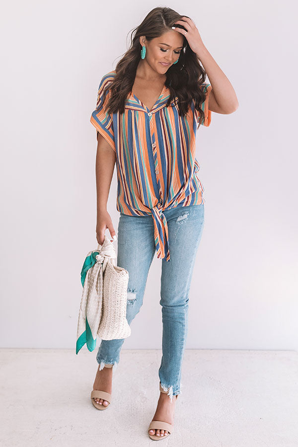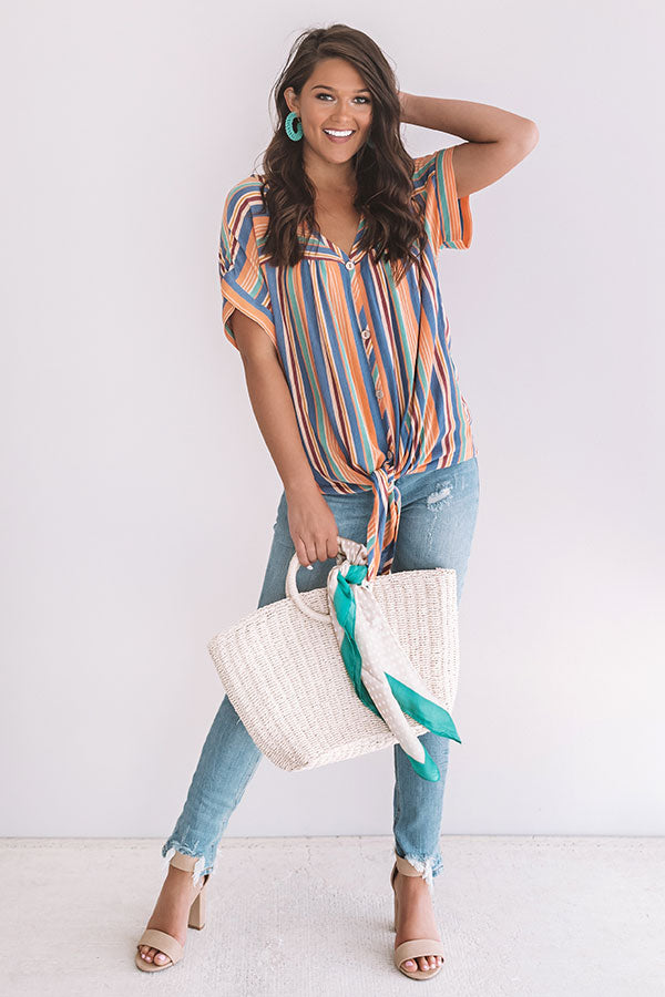Never underestimate the power of a perfectly striped top! This piece buttons down the front and the hem in the back is longer than the hem tie in the front giving it a drapey look! Pair this colorful piece with some light denim pants, an oversized tote, and some nude heels for a lively happy hour outfit! Measurements