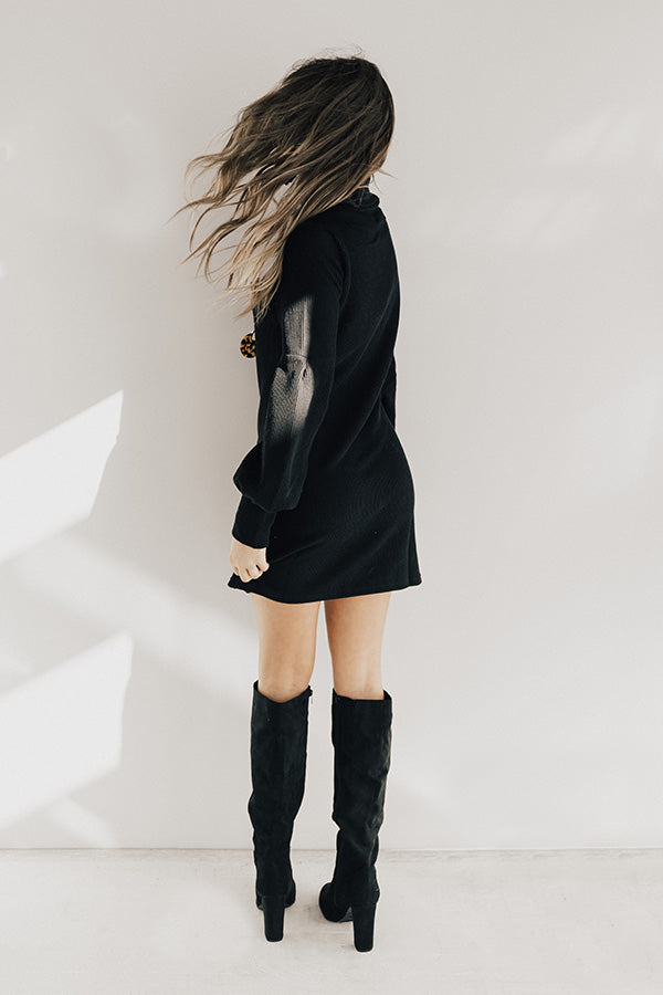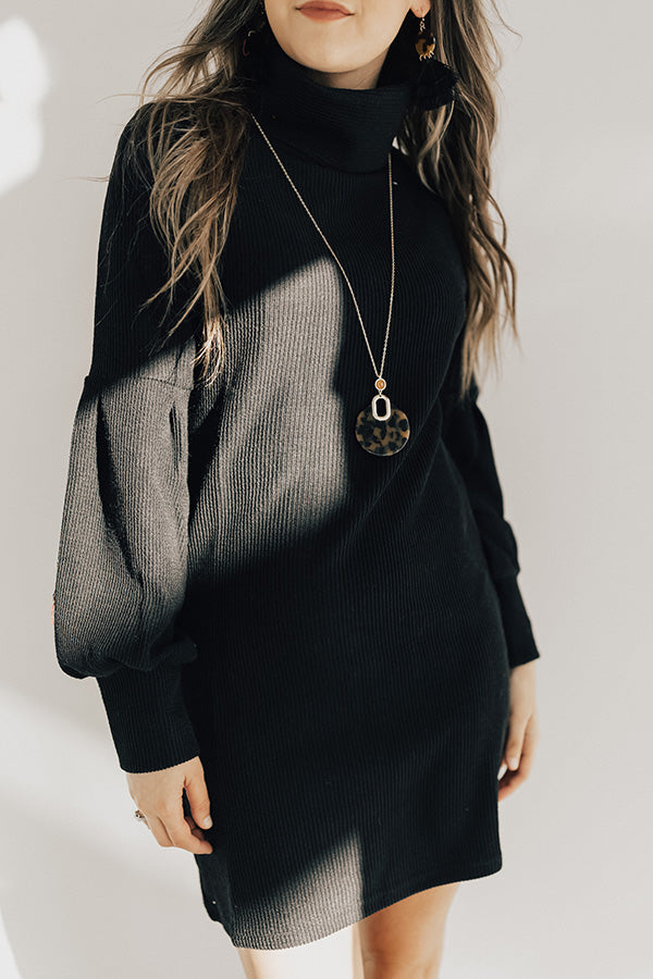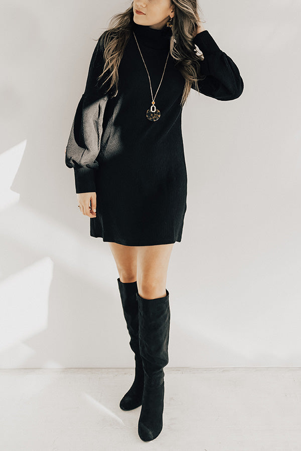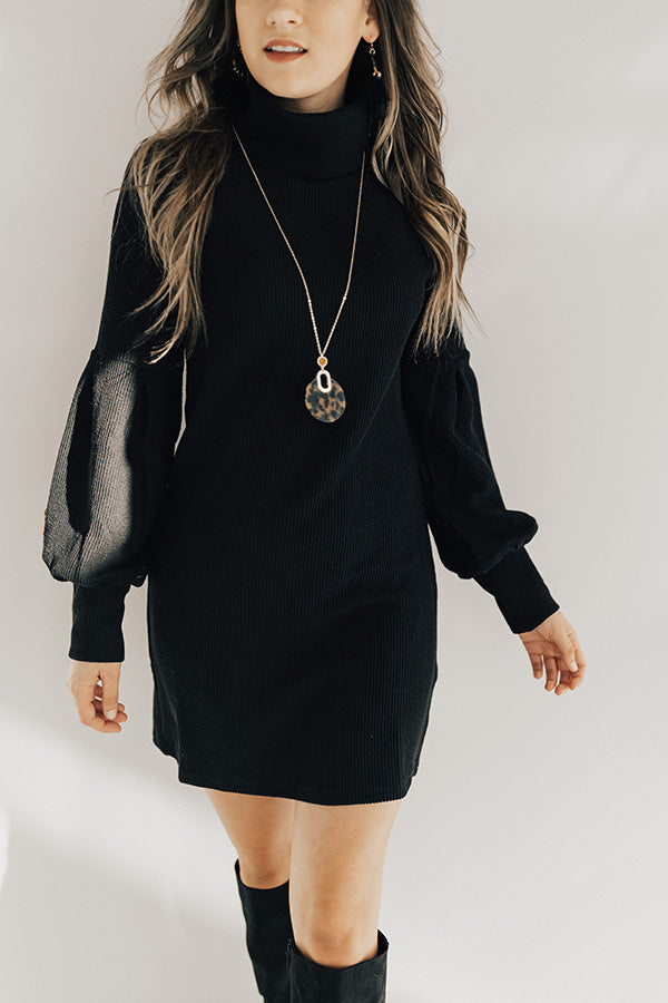 Dress to impress in our darling little black "Hey Pumpkin" dress featuring soft lightweight tight knit material with ribbed texturing, a high turtle neckline, long sleeves with bubble forearms and fitted cuffs, and a relaxed silhouette that falls into a straight mid-thigh length hemline! Measurements