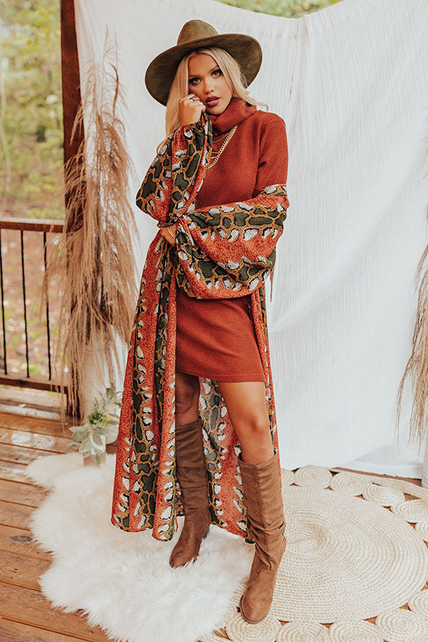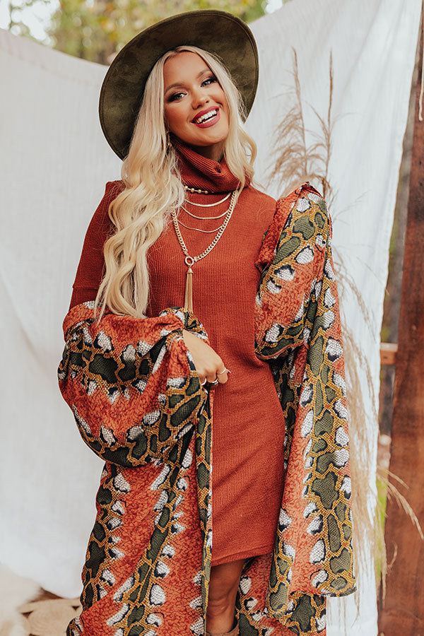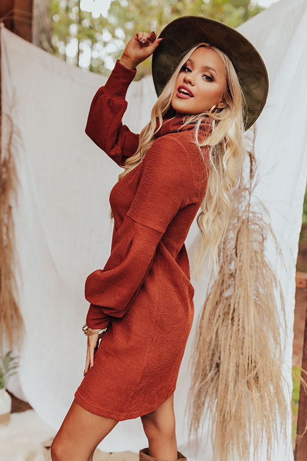 Dress to impress in our darling rust colored "Hey Pumpkin" dress featuring soft lightweight tight knit material with ribbed texturing, a high turtle neckline, long sleeves with bubble forearms and fitted cuffs, and a relaxed silhouette that falls into a straight mid-thigh length hemline! Measurements