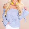 Grab a cute sailor & set sail in this seersucker striped sweetie! This classic cutie has an elasticized off-the-shoulder neckline, a relaxed bodice & long bell sleeves with tie cuffs. Style this beauty with white skinnies... And SEAS the day!