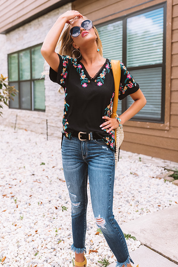 Liven up the party in our intricate black "Hey, Senorita" top featuring lightweight material patterned with colorful floral embroidery, a v-cut neckline with subtle pom pom accent trim, short loose sleeves, and a relaxed silhouette that falls into a straight hemline with side slits! We have styled this eye-catching piece with some distressed dark wash skinnies, sunnies, and a mustard wedge and woven tote, but you can also wear it with some frayed white shorts and "The Lyla Sandal in Hot Pink!" Measurements