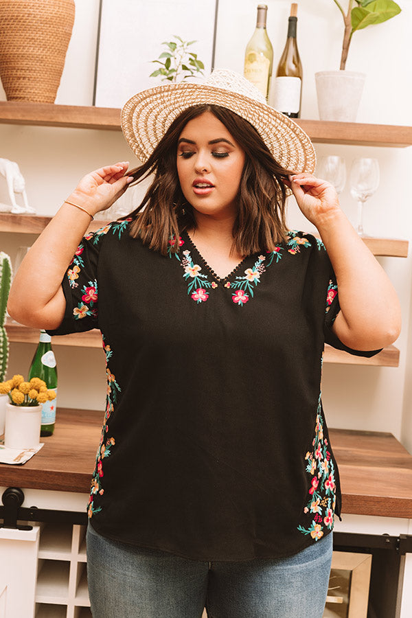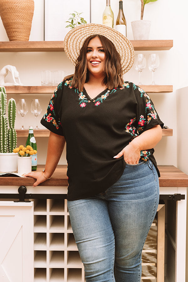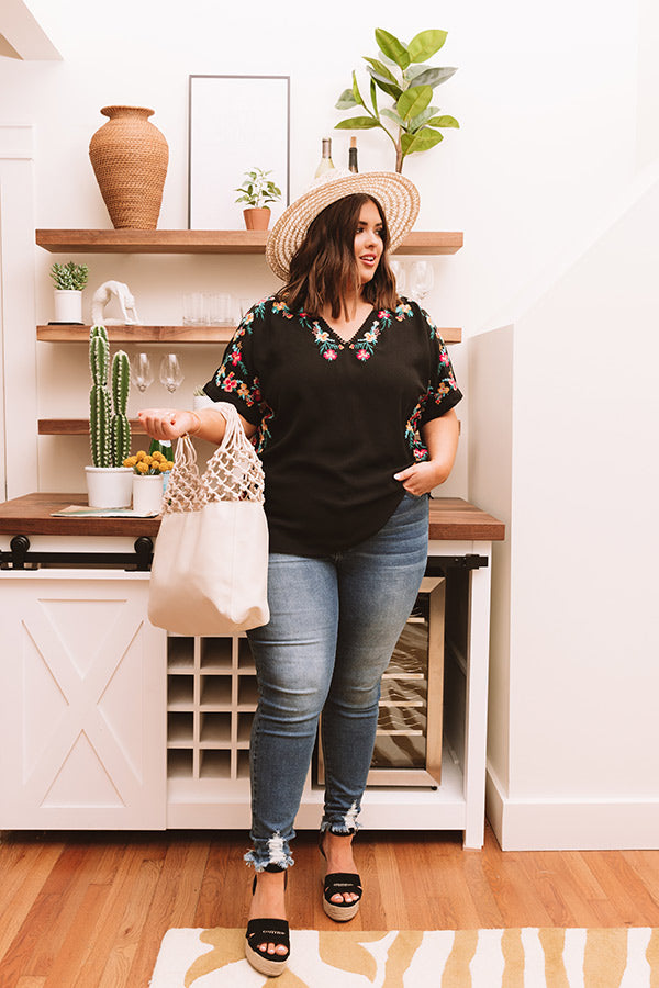 Plus Size - Liven up the party in our intricate black "Hey, Senorita" top featuring lightweight material patterned with colorful floral embroidery, a v-cut neckline with subtle pom pom accent trim, short loose sleeves, and a relaxed silhouette that falls into a straight hemline with side slits! We have styled this eye-catching piece with some distressed dark wash skinnies, black block heels, a faux leather tote, and a woven hat, but you can also wear it with some frayed white shorts and "The Lyla Sandal in Hot Pink!" Measurements