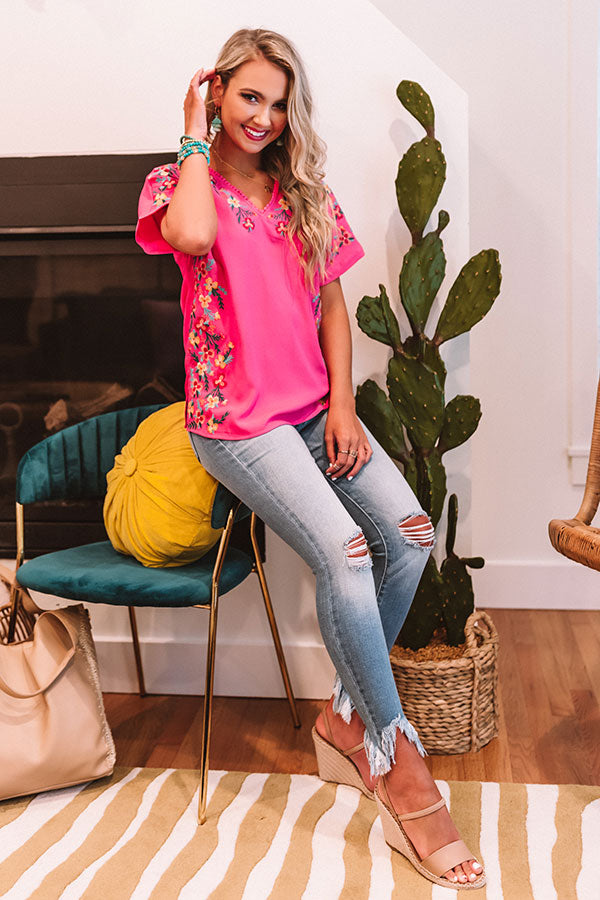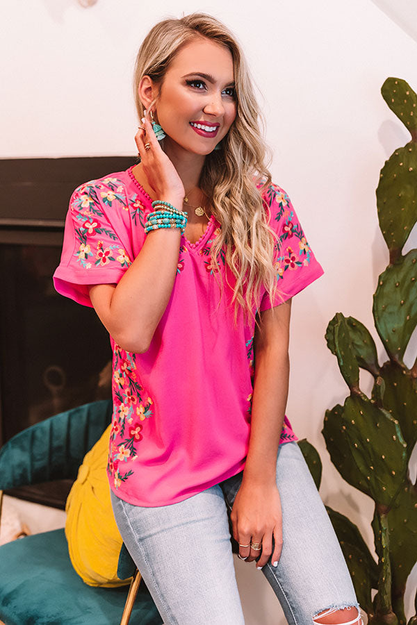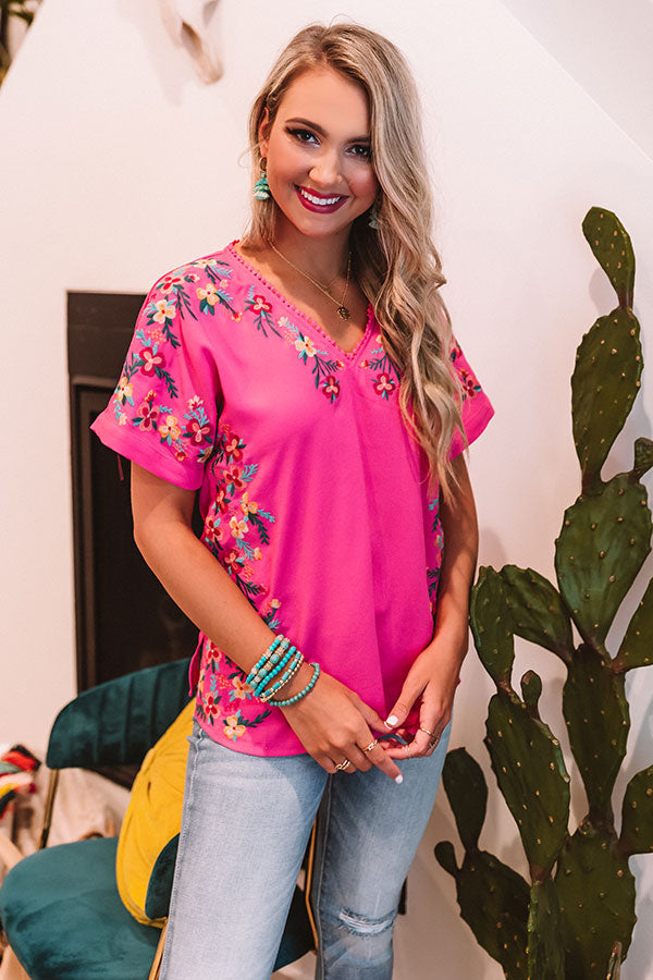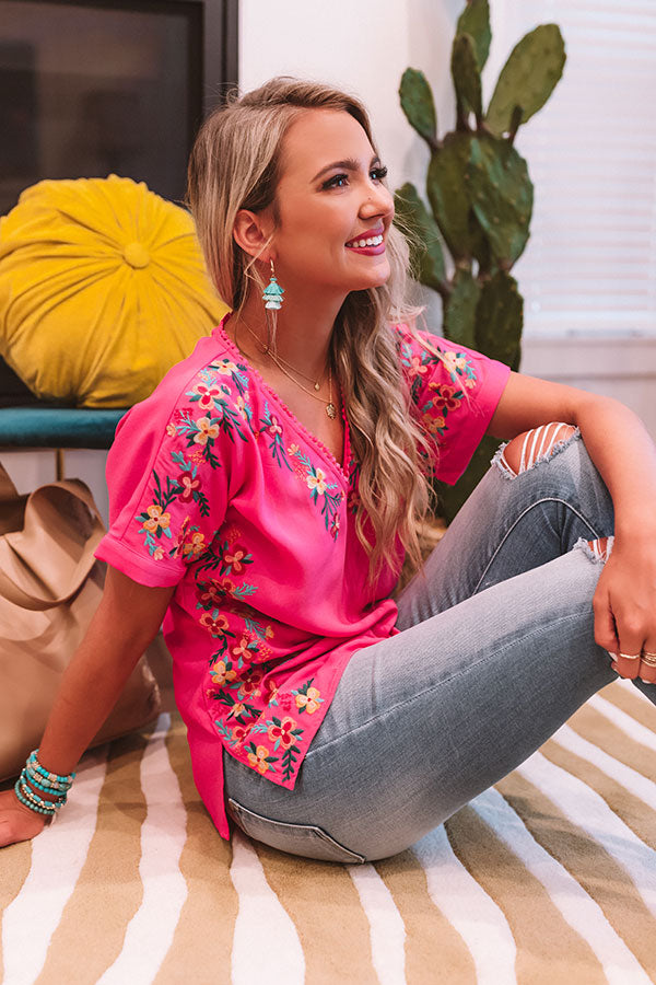 Liven up the party in our intricate hot pink "Hey, Senorita" top featuring lightweight material patterned with colorful floral embroidery, a v-cut neckline with subtle pom pom accent trim, short loose sleeves, and a relaxed silhouette that falls into a straight hemline with side slits! We have styled this eye-catching piece with some distressed light wash skinnies, turquoise statement jewelry, and neutral wedges, but you can also wear it with some frayed white shorts, "The Lyla Sandal in Hot Pink," our "Serving Up Chic Headband in Ocean Blue," and our "Costa Kisses Woven Tote!" Measurements