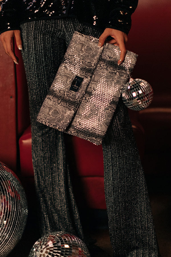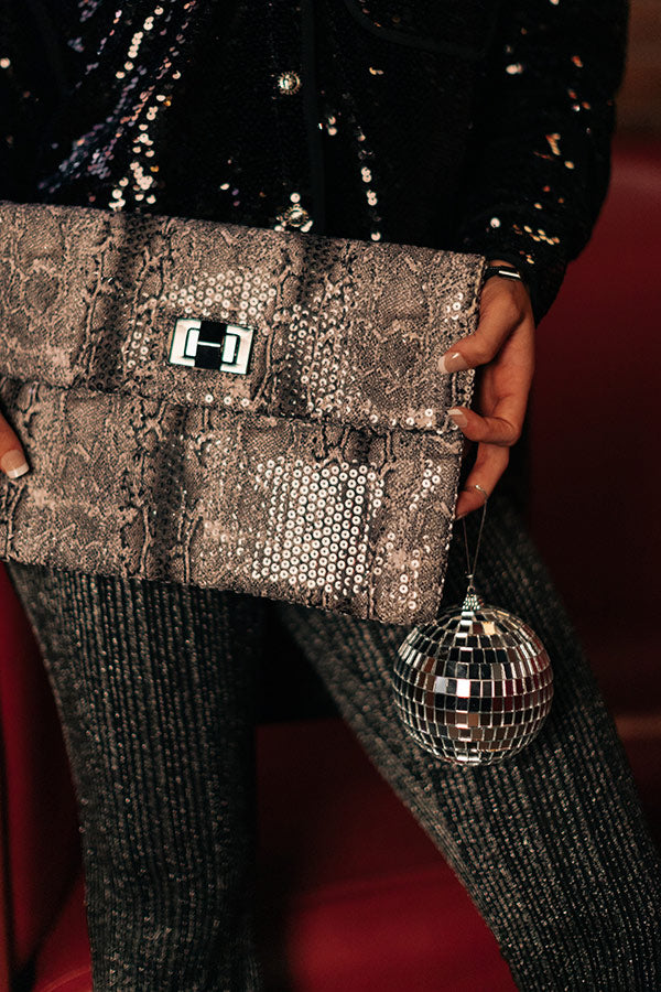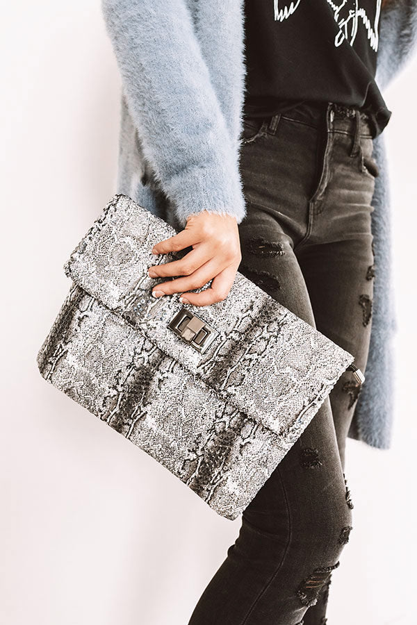 You are sure to be a "showstopper" when you accessorize with this glamorous clutch featuring a bold grey snake print pattern covered in clear sequins, a flap closure with a silver twist accent, a spacious zipped pouch with additional inside pockets, and a removable chain link crossbody strap!