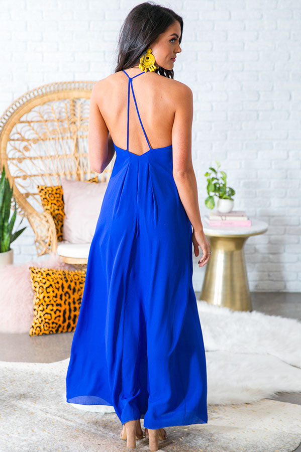 Roll into your next event like royalty in this stunning royal blue maxi dress! This gorgeous maxi has a sleeveless bodice, an ultra relaxed poly silhouette & a gorgeous strappy open back. Take your look to the next level with a colorful statement earring or a sassy clutch!