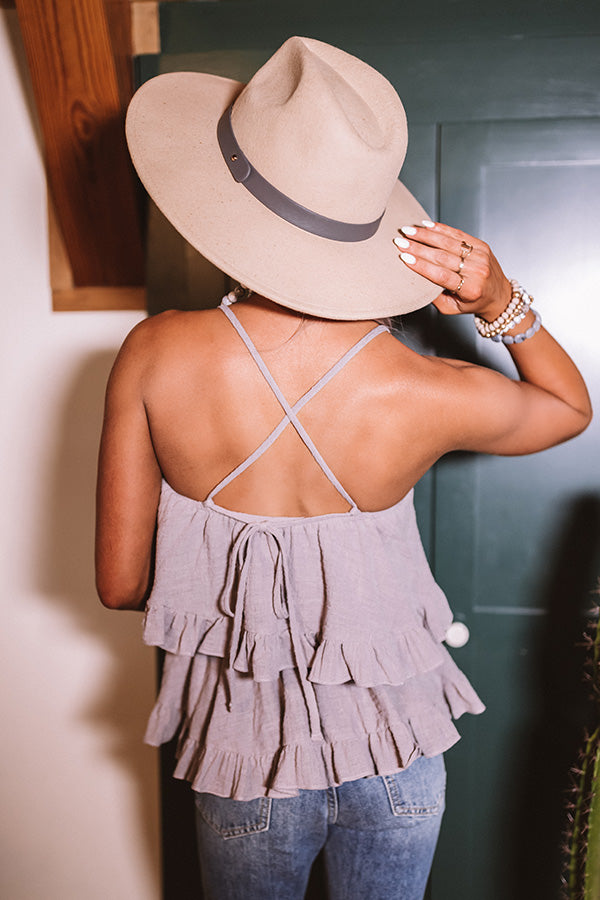 Add something sweet to your wardrobe with our adorable grey "Hey Sugar, Sugar" top featuring lightweight breezy material with subtle texturing, a straight neckline, spaghetti straps that cross in the back with a tie closure, and a relaxed two-tiered silhouette that falls into an uneven hemline with ruffled trim detailing! We have styled this darling piece with some distressed light wash denim, snake print block wedges, and a wool hat, but you can also layer it under our "Let's Stay Home Popcorn Knit Cardigan in Ivory" with some frayed denim shorts, "The Alba Wedge in Ivory," and our "New On The Block Faux Leather Fringe Tote in Grey!" Measurements
