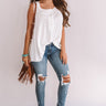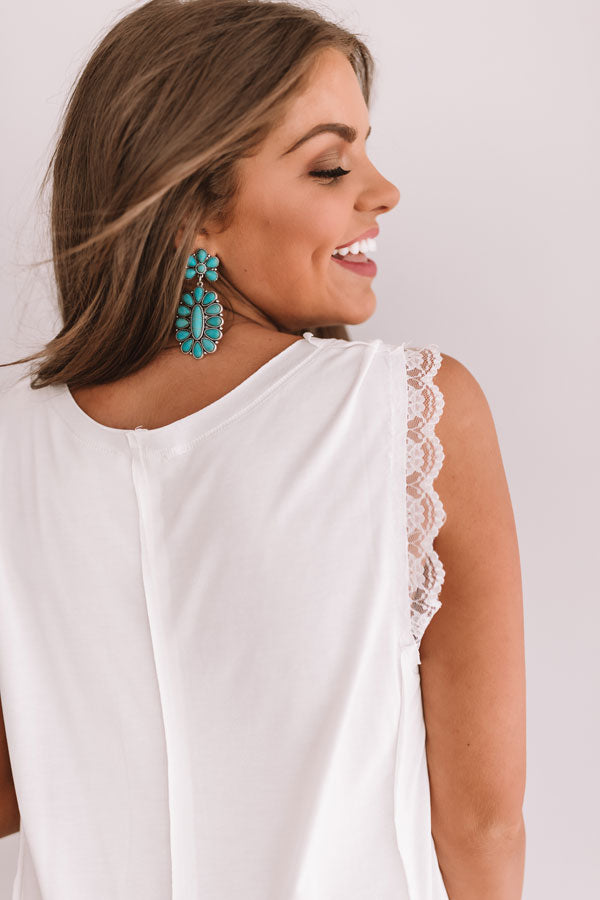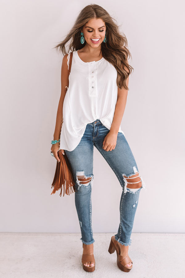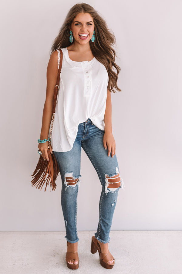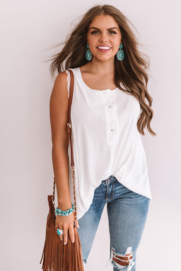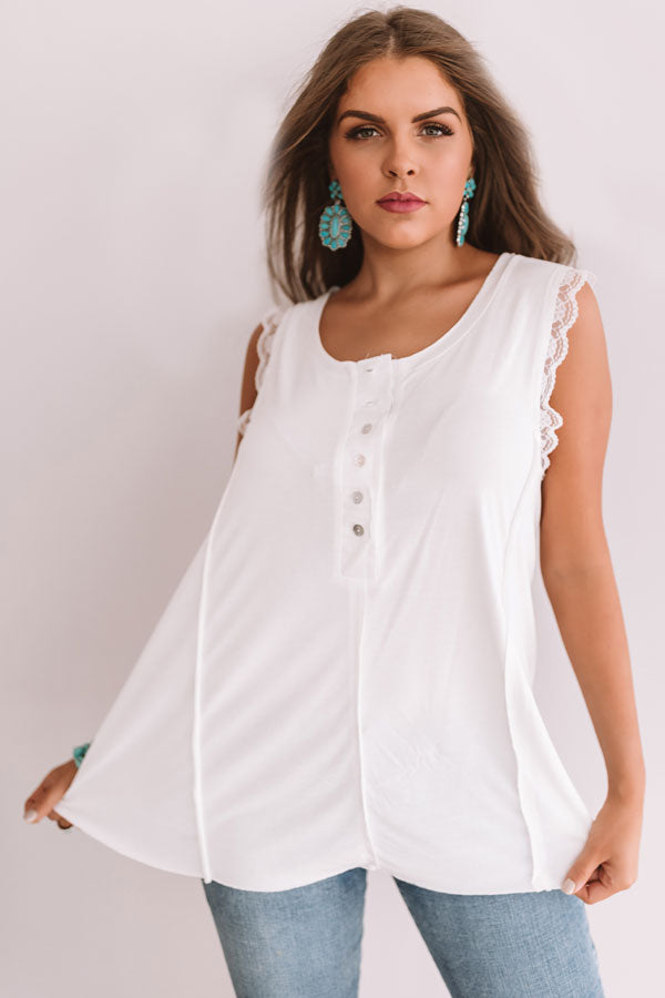 Hey, sweetheart! This shift tank features lace trim sleeves and six buttons down the front! Style this dainty white piece with distressed jeans, a chunky heel, and a fringe bag for an adorable boho inspired look!