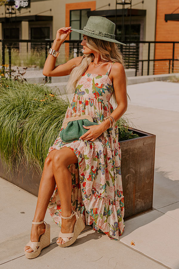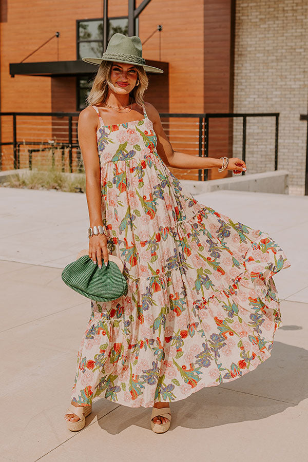 - Welcome our newest floral obsession into your wardrobe! With its gorgeous floral print and flowy silhouette, it bursts with sweet energy. From breezy walks down the coastline to fabulous garden parties, this darling dress is perfect for a charming vibe. - Semi-sheer crinkle fabric with an abstract floral print featuring ivory, blue, purple, green, and pink hues - A built-in lining that ends at mini dress length - Adjustable spaghetti straps - A smocked upper back - Ruffle detailing at the skirt - A flowy yet flattering silhouette that ends in a maxi length hemline