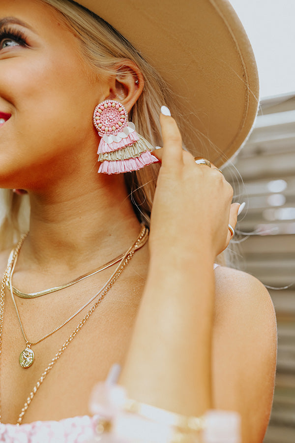 Take your look to a whole new level by accessorizing with our gorgeous pink 'Hibiscus Kisses' statement earrings featuring oversized beaded circle studs and three tiered tassel fans!