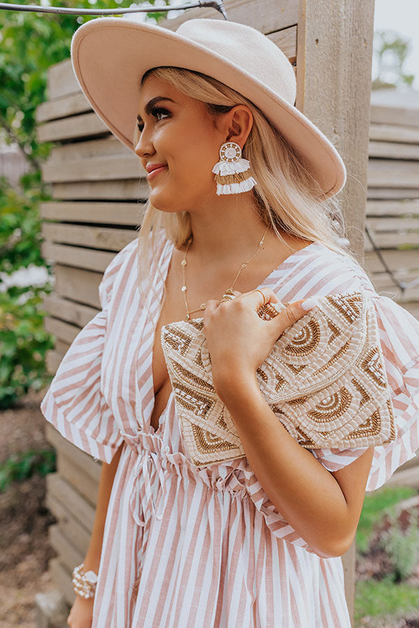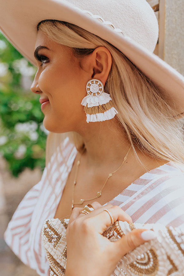 Take your look to a whole new level by accessorizing with our gorgeous white 'Hibiscus Kisses' statement earrings featuring oversized beaded circle studs and three tiered tassel fans!