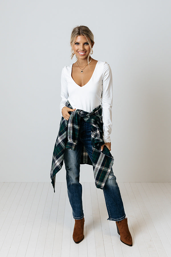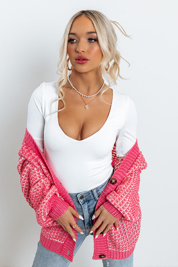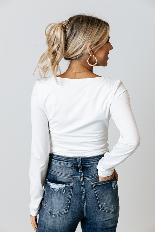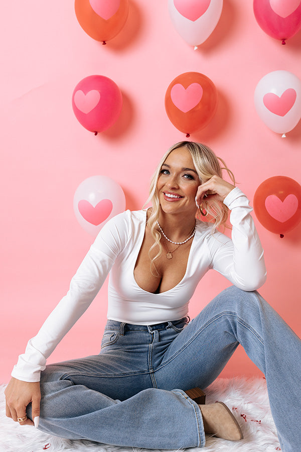 You won't be able to hide how much you like this basic white bodysuit with its lightweight material, scooped v-cut neckline, long loose sleeves, and relaxed but flattering silhouette that ends in cheeky fit bottoms with a snap button closure!