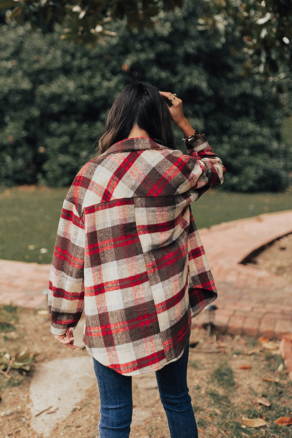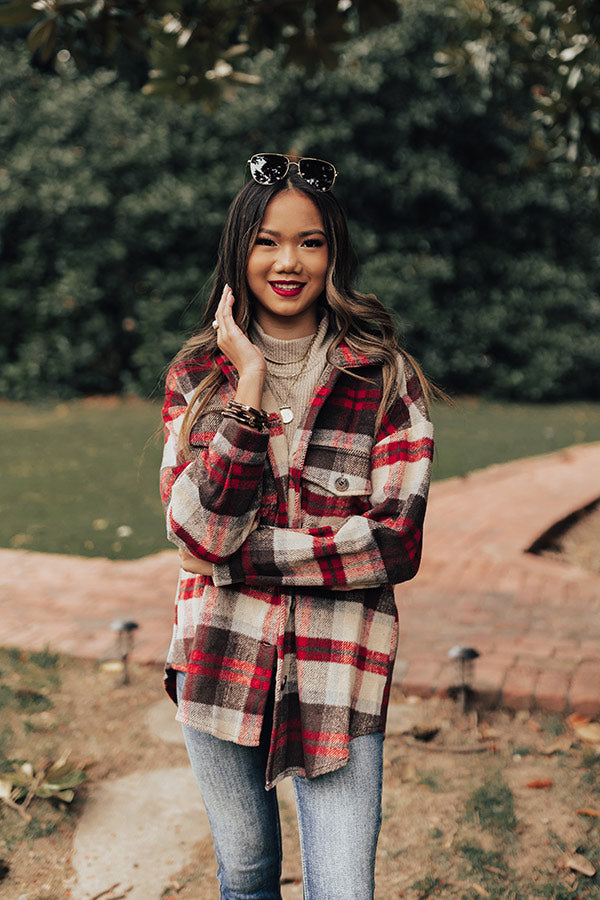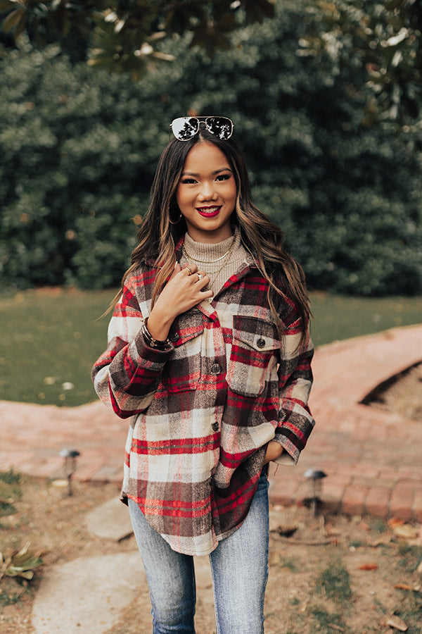 Layer up for the holidays in our pretty 'Hidden In Plain Sight' jacket featuring warm material patterned with a brown, red, and ivory hued plaid print, a button down front with a collared neckline, long loose sleeves with button closure cuffs, two accent chest pockets with flap closures, and a relaxed silhouette that falls into a rounded hemline! Measurements