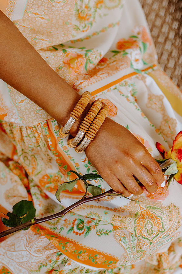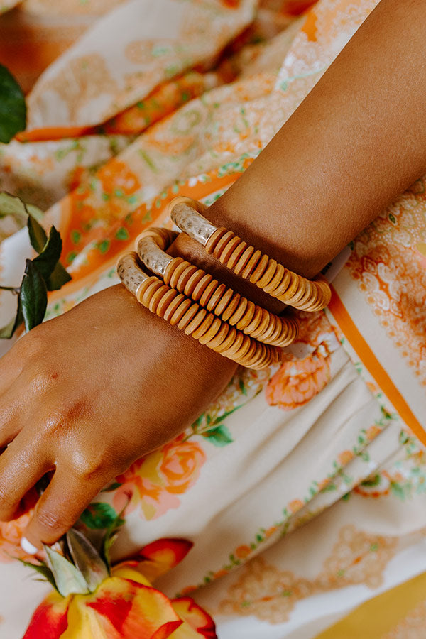 Our luxe 'Hidden Paradise Bracelet' features a stacked camel colored stretch band, perfect for wearing solo as part of your arm candy stack!