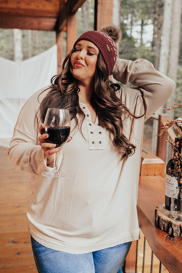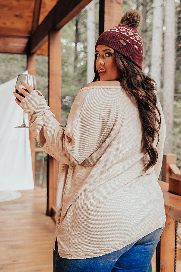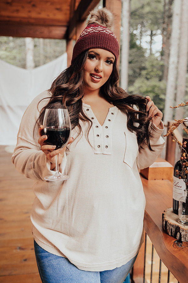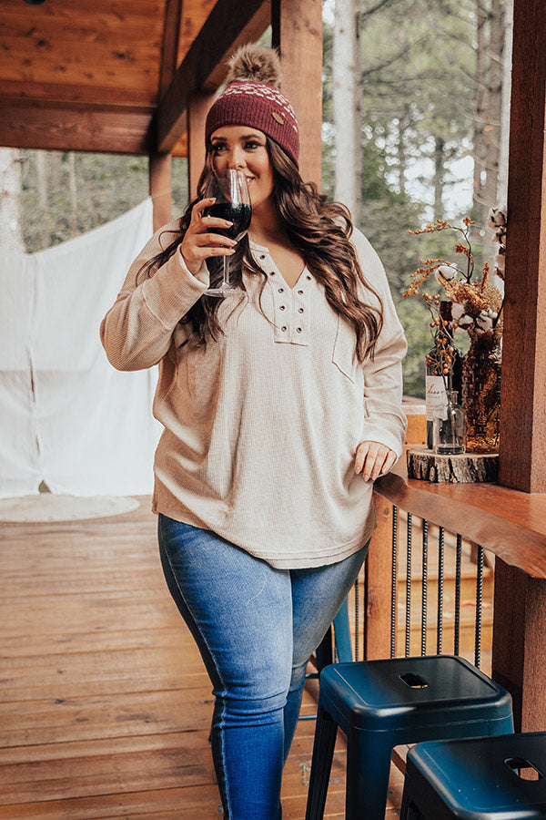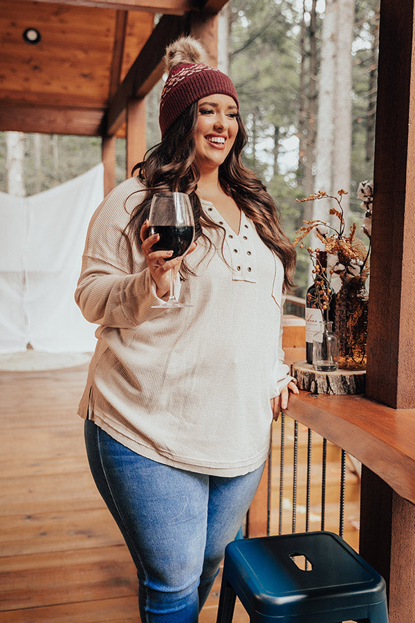 Plus Size - Take on fall in style with our casual birch colored "Hidden Trail Henley Top" featuring soft lightweight flowy material with small waffle knit texturing, a v-cut neckline with lace-up eyelet detailing, long loose sleeves, a single accent chest pocket, exposed raw cut seams and trim, and a relaxed silhouette that falls into a straight hemline with side slits! Measurements