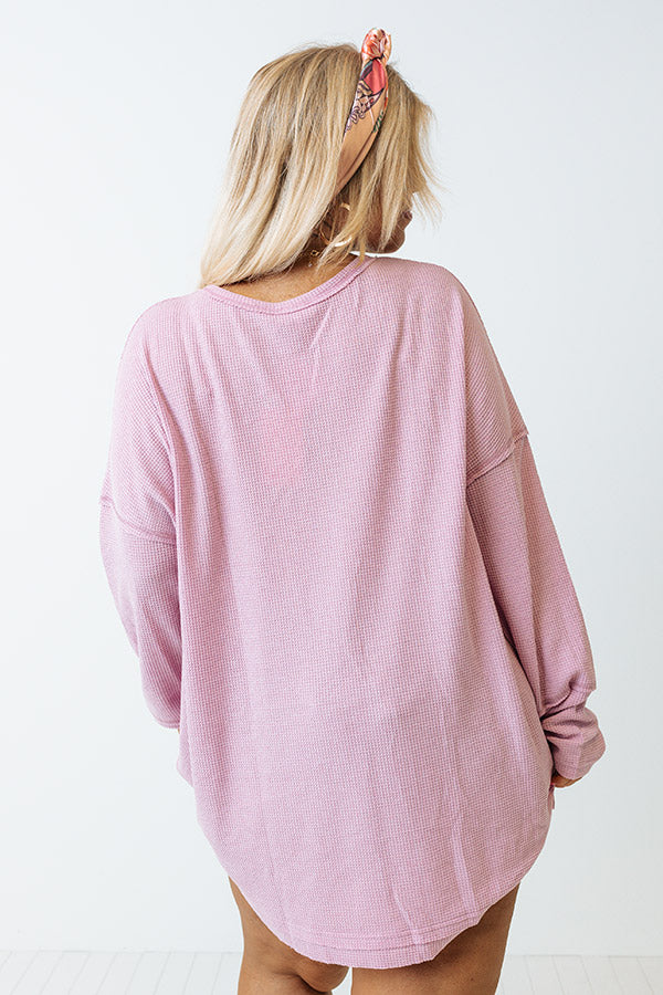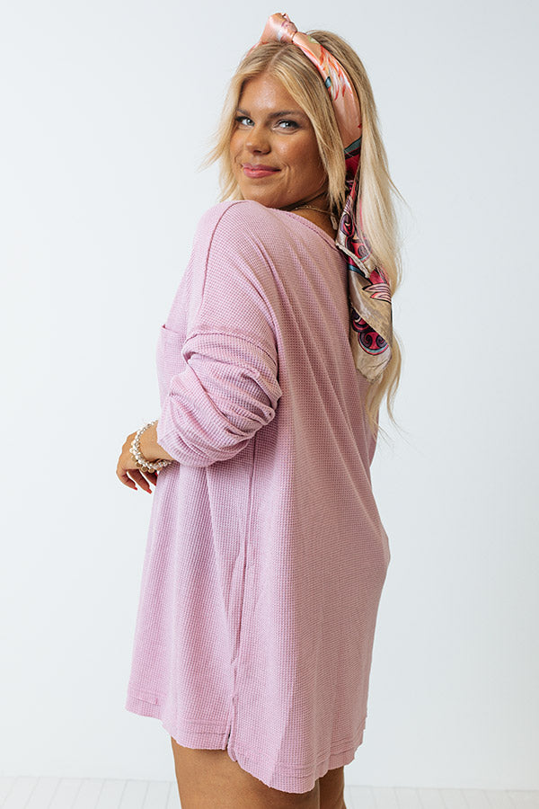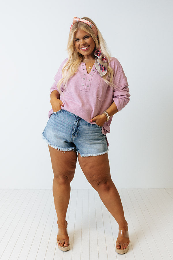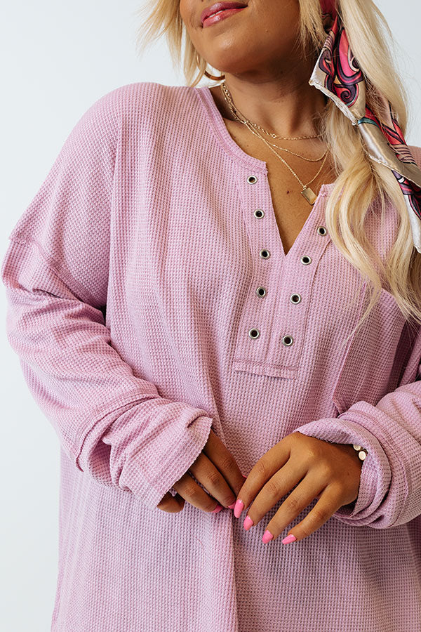 Plus Size - Take on any season in style with our casual lavender colored 'Hidden Trail Henley Top' featuring soft lightweight flowy material with small waffle knit texturing, a v-cut neckline with lace-up eyelet detailing, long loose sleeves, a single accent chest pocket, exposed raw cut seams and trim, and a relaxed silhouette that falls into a straight hemline with side slits!