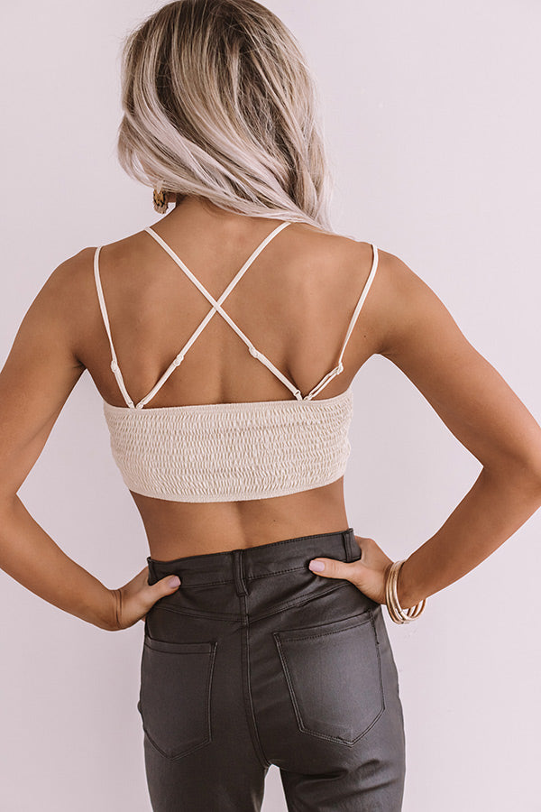 Add a femme and flirty touch to any look when you layer with the cream "Hide And Seek" bralette featuring a v-cut neckline, intricate lace detailing, double adjustable spaghetti shoulder straps with one set criss crossing in the back, a low open back, a wide waistband, and fully lined elastic band seamed cups!