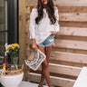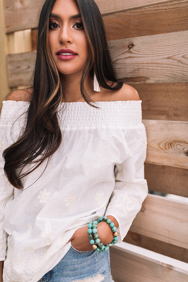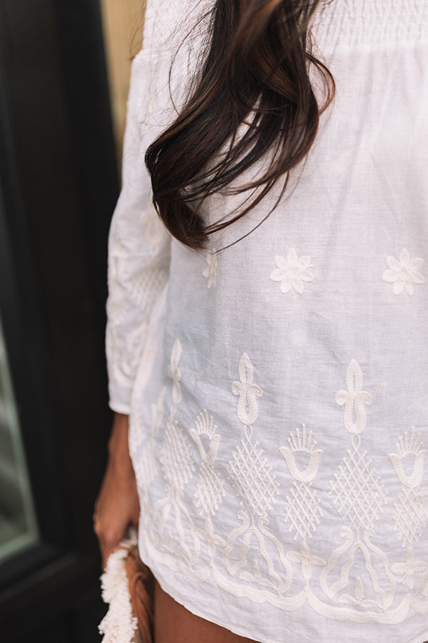 Upgrade your wardrobe with our cute white 'Hideaway Beach' top featuring lightweight material with embroidered floral detailing throughout, a straight and wide smocked off shoulder fit with loose 3/4-length drop sleeves, and a relaxed silhouette that falls into a straight tunic-length hemline!