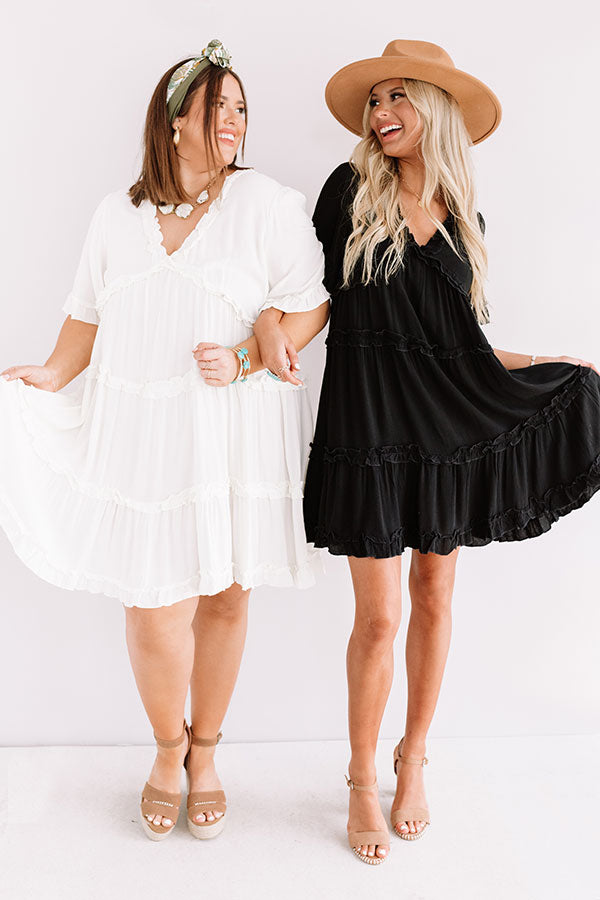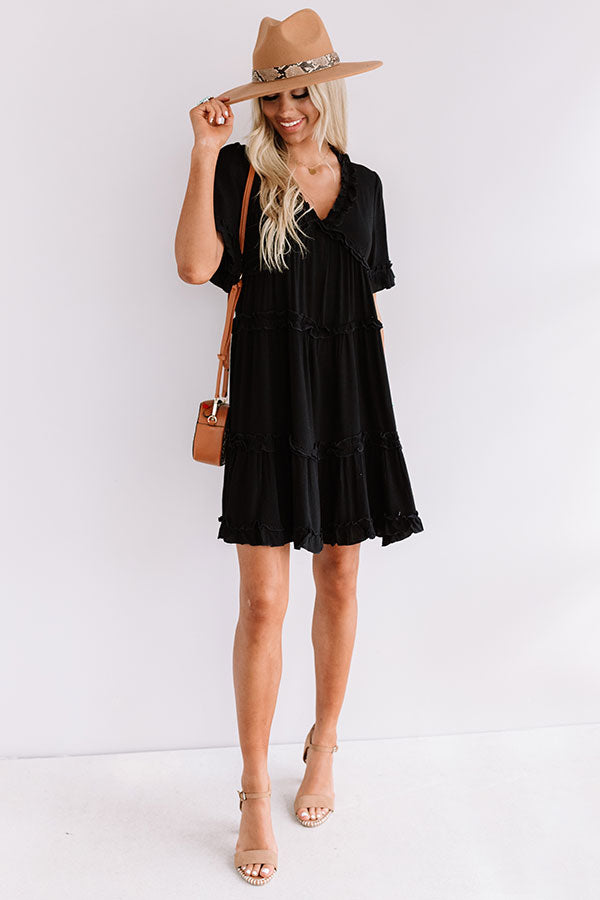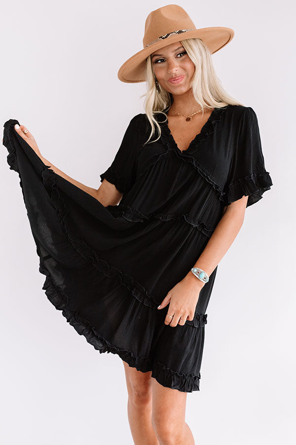 Keep your fashion standards high in this adorable black dress featuring lightweight breezy material, a v-cut neckline, short loose sleeves with ruffled trim detailing, exposed raw-cut ruffled accent seams, and a relaxed babydoll silhouette that falls into an uneven mid-thigh length hemline! This darling piece can be styled a variety of ways, like with some neutral heels and a snake print crossbody and matching faux leather hat, but you can also wear it layered under a cropped jean jacket with the "Steve Madden Mckenzie Wedge in Black!" Measurements