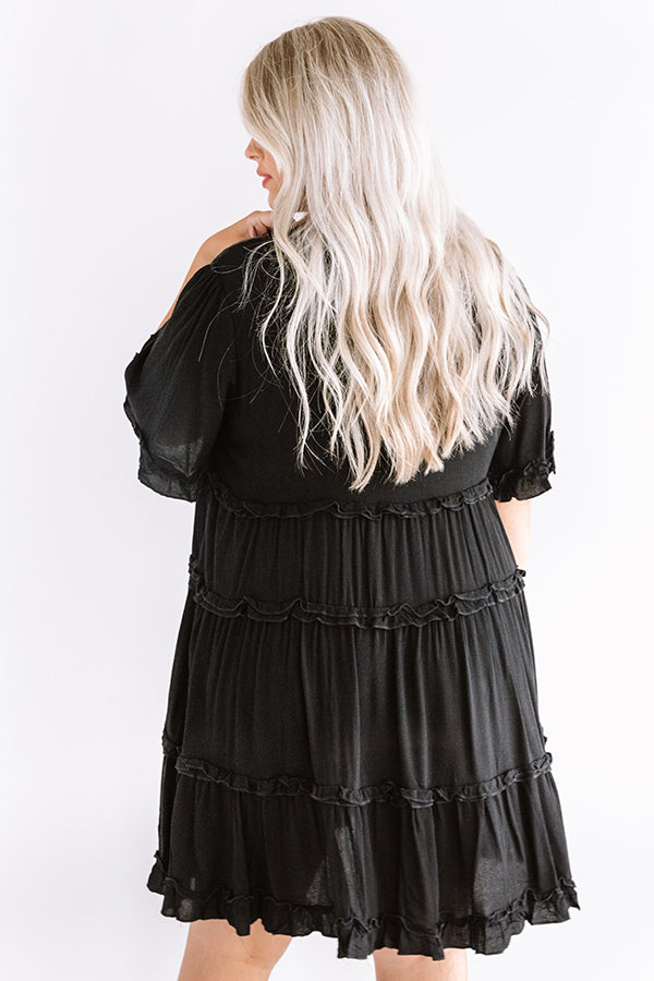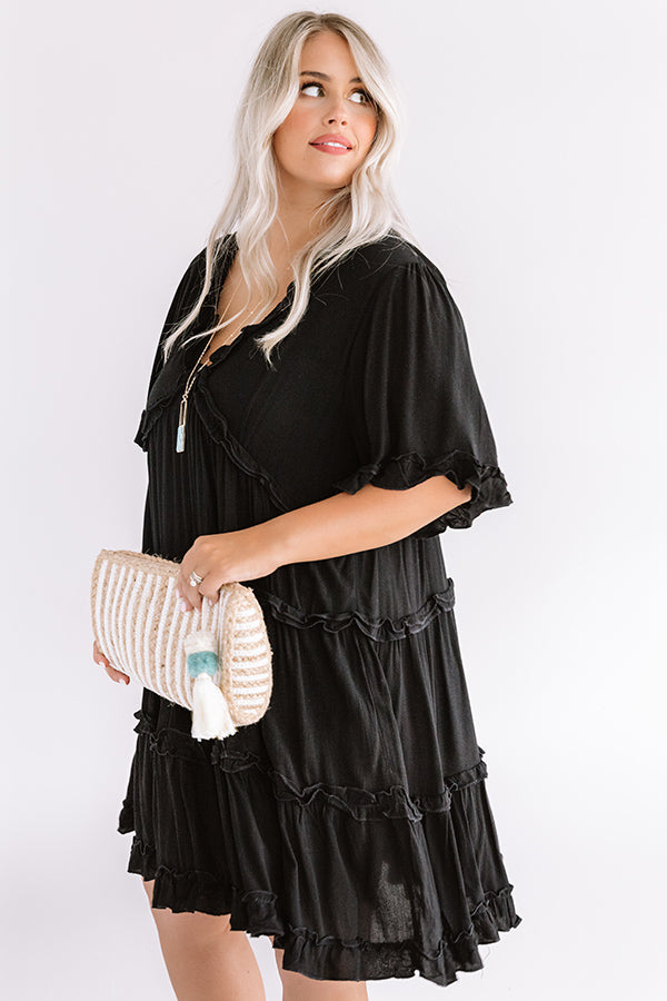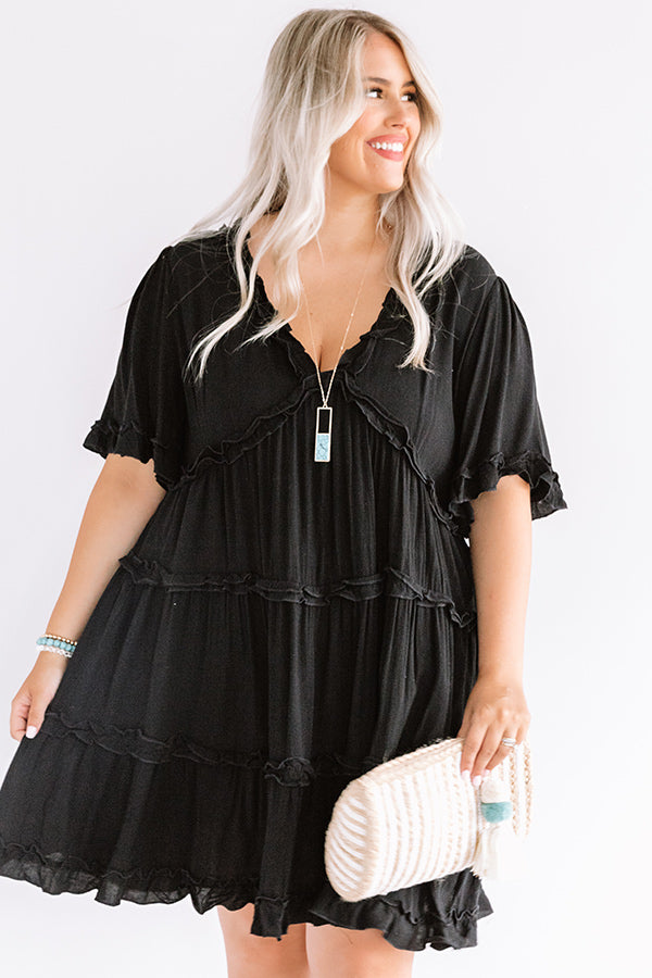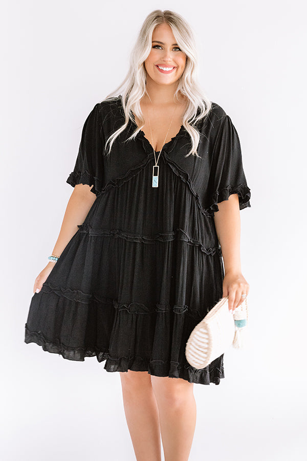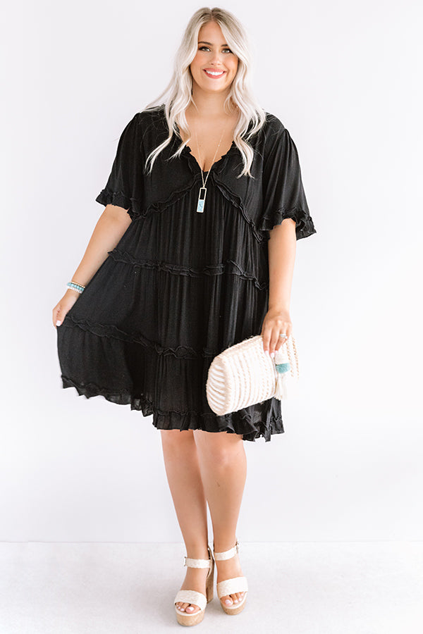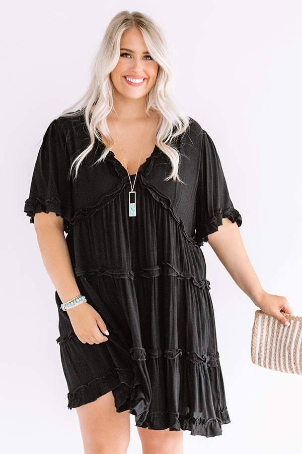 Plus Size - Keep your fashion standards high in this adorable black dress featuring lightweight breezy material, a v-cut neckline, short loose sleeves with ruffled trim detailing, exposed raw-cut ruffled accent seams, and a relaxed babydoll silhouette that falls into a straight mid-thigh length hemline! This darling piece can be styled a variety of ways, like with a woven block heel and clutch, but you can also wear it layered under a cropped jean jacket with the "Steve Madden Mckenzie Wedge in Black" and our "Fated Love Wool Hat!" Measurements