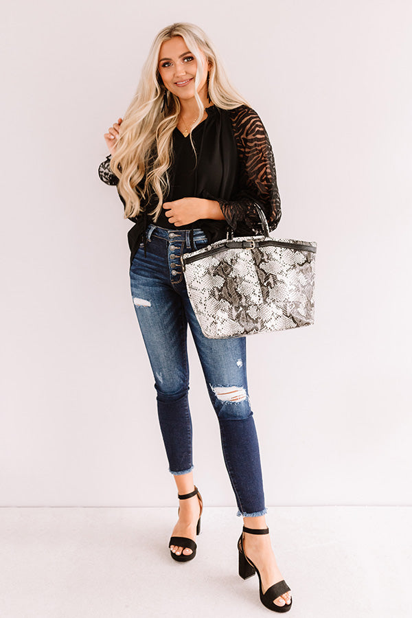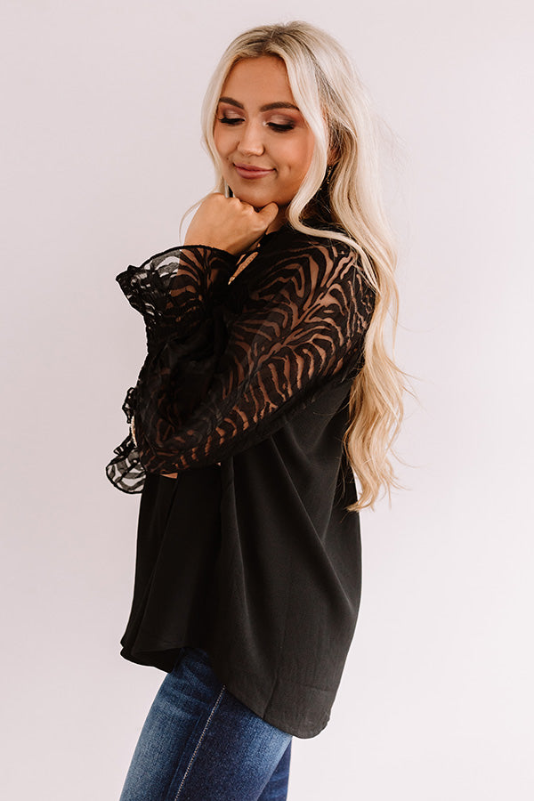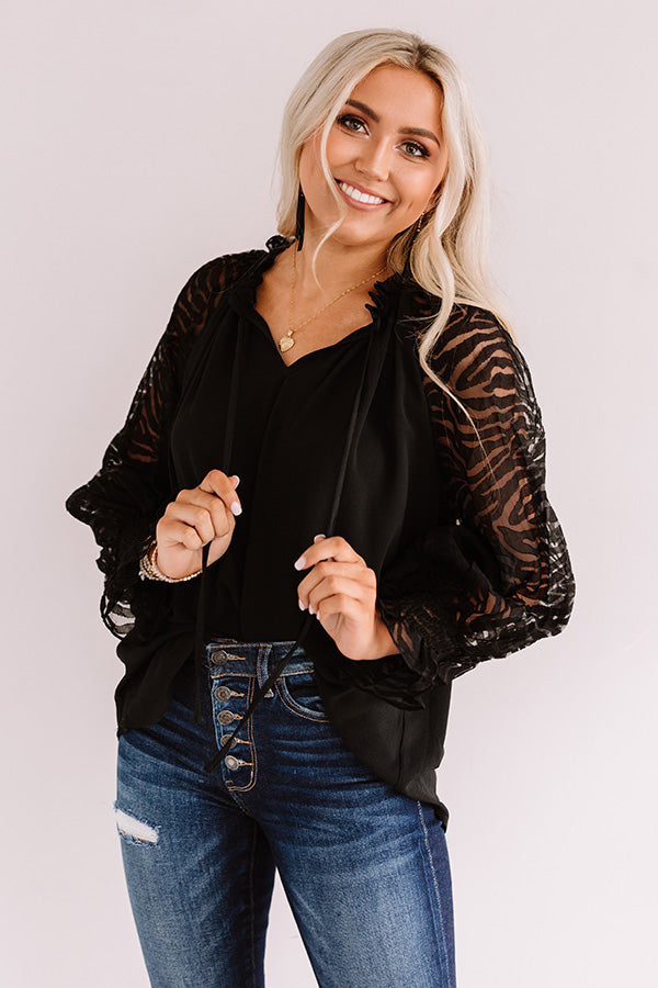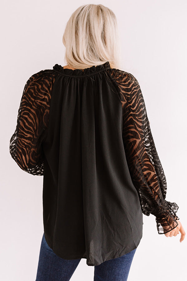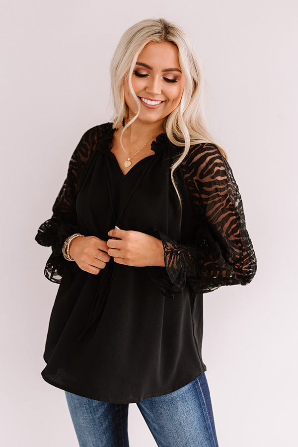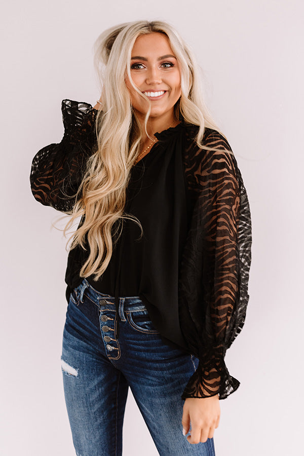Keep your fashion standards high with this elegant black shift top featuring sleek lightweight flowy material, a v-cut tie closure neckline with a subtly ruffled collar, long oversized bubble sleeves patterned with a semi-sheer zebra print and flared elastic cuffs, and a relaxed silhouette that falls into a rounded hemline! Measurements