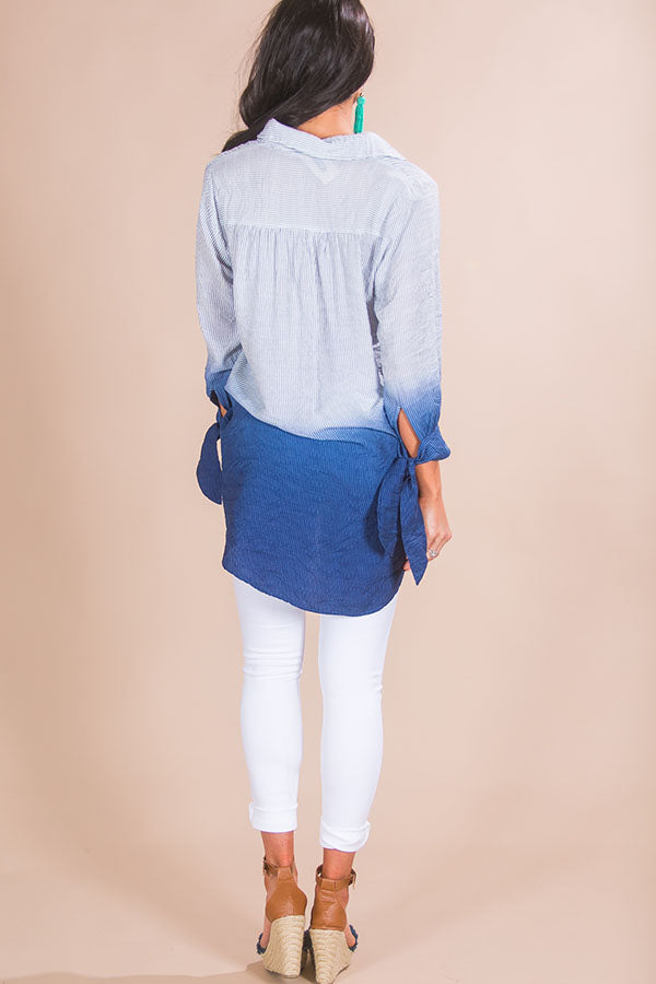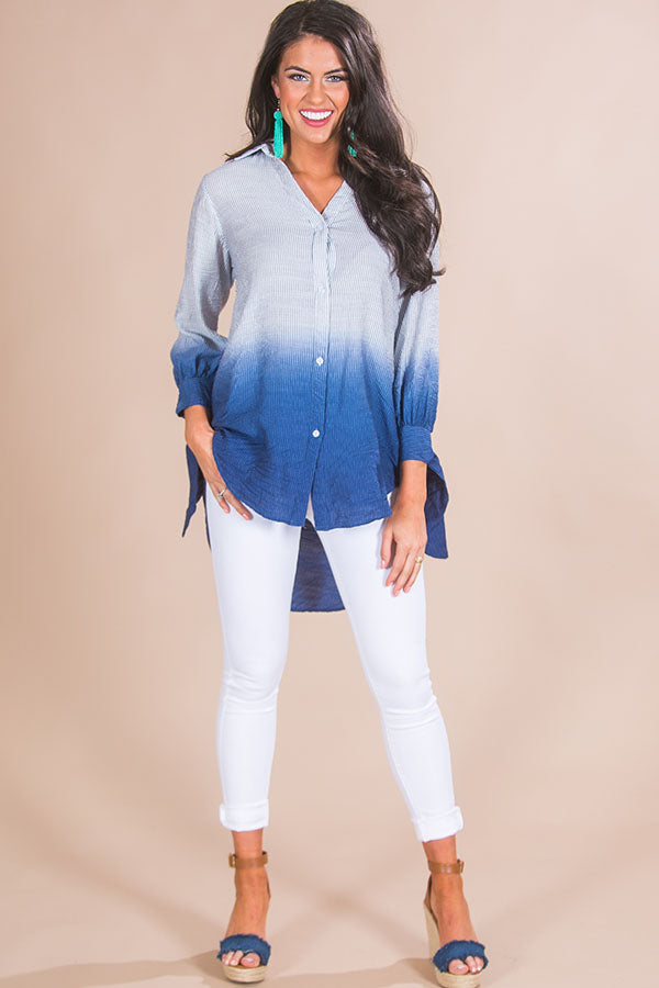 Go with the flow in this striped sweetie! This button-down babe has quarter-length sleeves that tie at the cuff, a collared neckline, relaxed button-down bodice & a rounded high-low bottom hem. Style this classic cutie with your favorite white denim for an ombre-lievable look!
