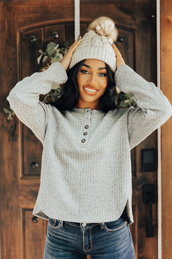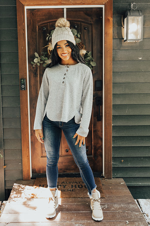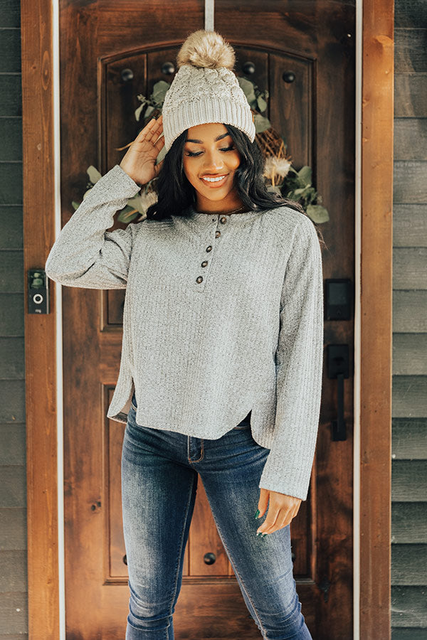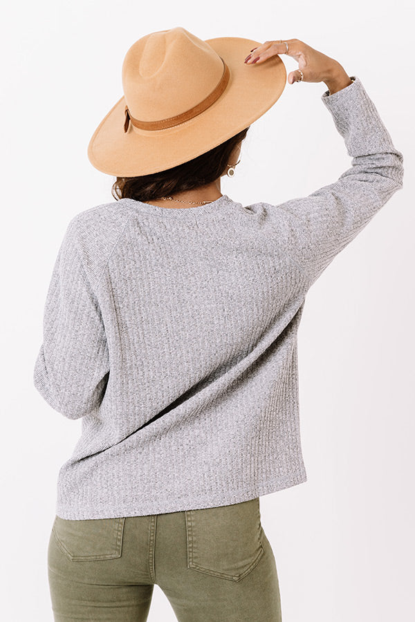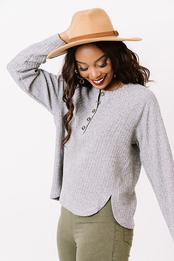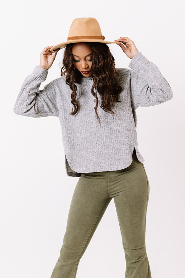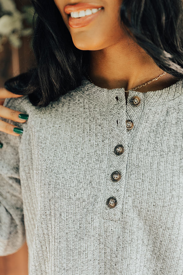 Look casual comfortably in our versatile grey 'Highest Hope Shift Top' featuring lightweight material with subtle ribbed texturing, a button up bodice with a high rounded neckline, long loose sleeves, and a slouched silhouette that falls into a rounded hemline with accent side slits!
