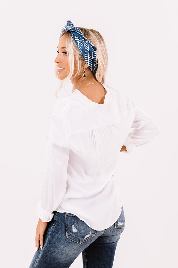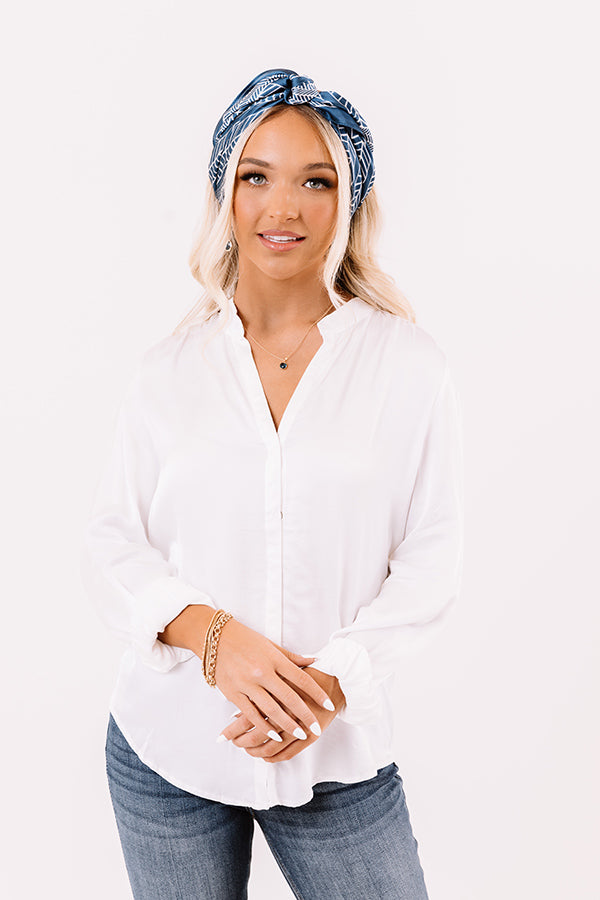 Hold you wardrobe to the highest standards with this adorable white top featuring lightweight satin material, a button down front with a v-cut neckline, long loose sleeves with button closure cuffs, and a relaxed but flattering silhouette that ends in a rounded hemline!