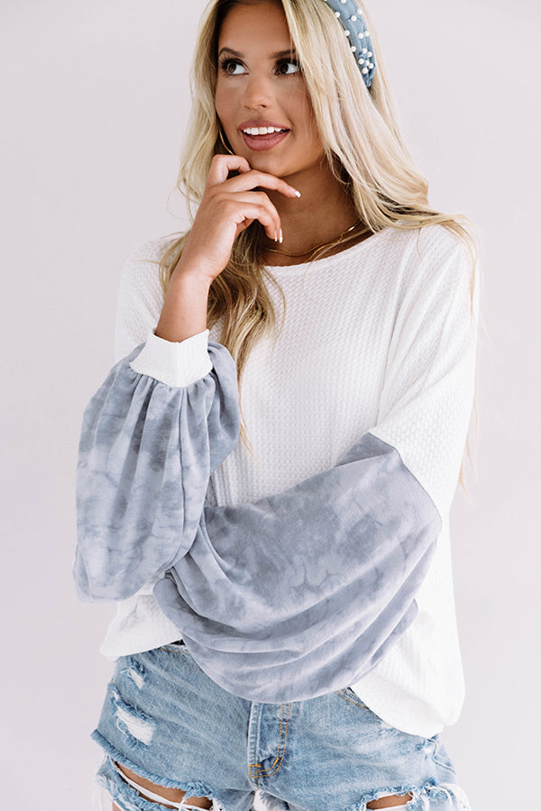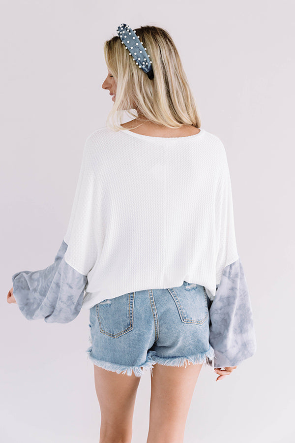 You are sure to look chic when you wear this adorable white top featuring soft lightweight material with waffle knit texturing, a rounded neckline that can be worn off one shoulder, long oversized bubble sleeves with fitted cuffs and grey tie dye on the forearms, and a relaxed silhouette that falls into a straight hemline that can be knotted! We have styled this cutie with some distressed denim shorts, a matching headband, navy wedges, and a white tote, but you can also wear it with our "Off Hours Joggers" and "The Calum Bootie in Grey!"