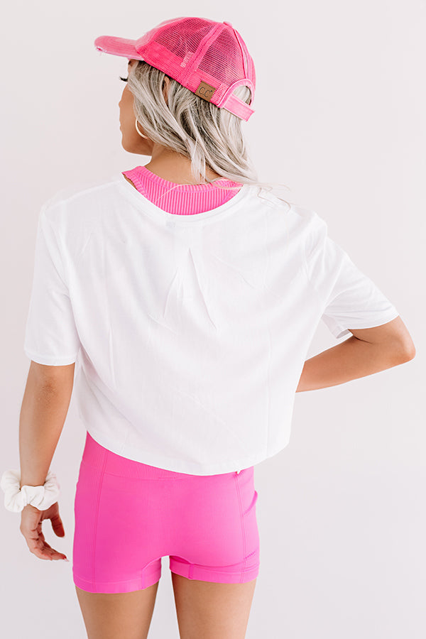 Whether you are heading to the gym or running errands, our white "Hikes And Happiness" top is perfect for every casual occasion! It features soft lightweight material, a high rounded neckline, short loose sleeves, and a relaxed silhouette that falls into a straight cropped hemline! We have styled this basic with some pink bike shorts, trendy sneakers, and a baseball cap and scrunchie, but you can also wear it with some distressed ankle skinnies, "The Lela Espadrille in White," sunnies, and our "Three Day Weekend Canvas Tote!"