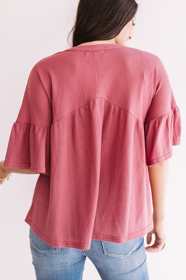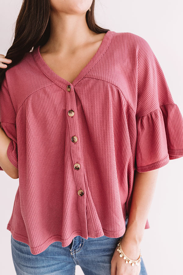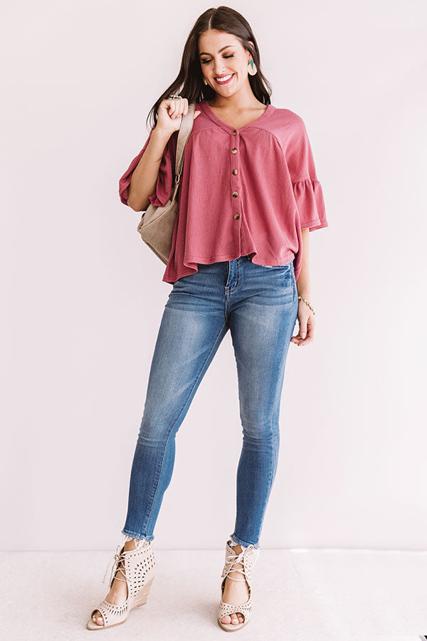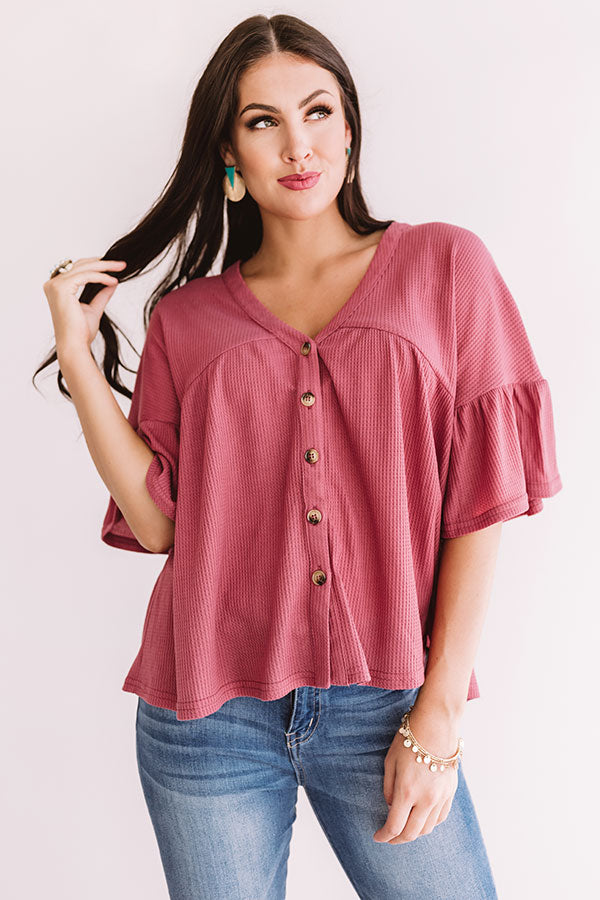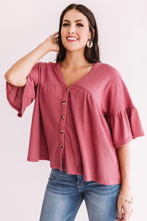 Slay all day with the "Hold Me Tight" berry top featuring a subtly textured lightweight material, half loose sleeves with flared cuffs, a button up bodice with a v-cut neckline, and a relaxed babydoll silhouette with a cropped straight hemline! This transitional basic can be styled with some ankle skinnies and a neutral cutout wedge and tote for chillier weather, or for the warmer seasons you can wear it with some distressed white shorts and you can add an accent pattern with "The Uptown Wedge in Leopard" and our "Leopard Forever Headband!" Measurements