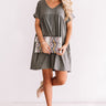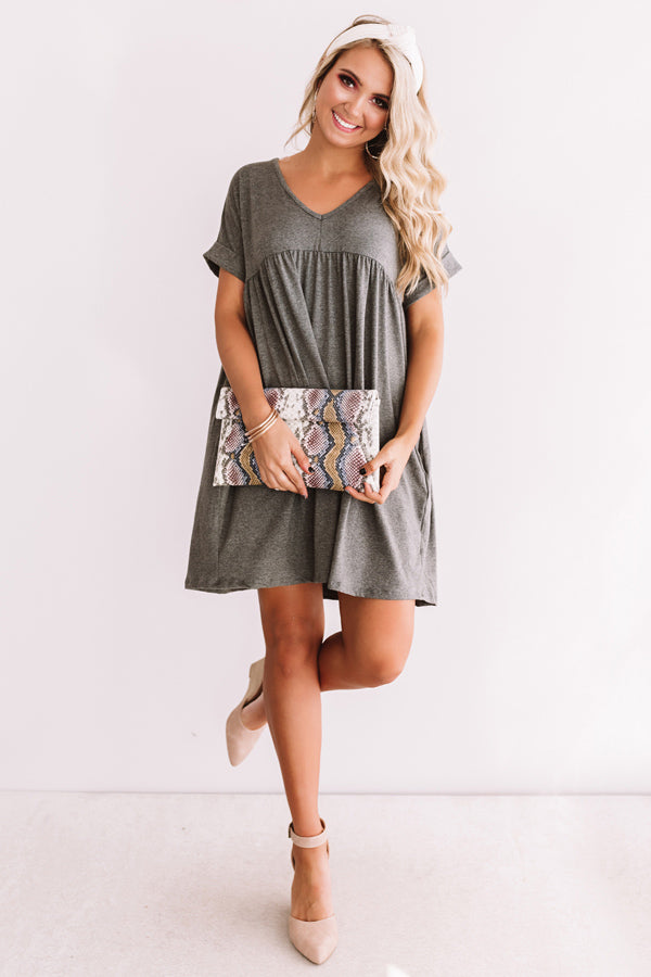 The "Holding Hands" dark grey dress is a year round fave with its stretchy lightweight material, a v-cut neckline, short sleeves with rolled cuffs, hidden side pockets, and a relaxed bodice that falls into a babydoll skirt with a straight mid-thigh length hemline! This transitional piece styles perfectly with a snake print clutch, neutral wedges, and an ivory headband for a fall night out look, or it can be worn with "The Karlie Bootie in Snake Print" and our "Forever Crushing Snake Print Earrings" for a more laid back OOTD! Measurements