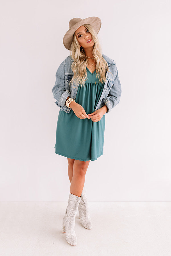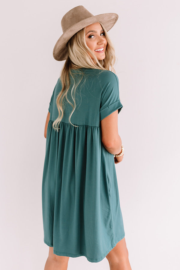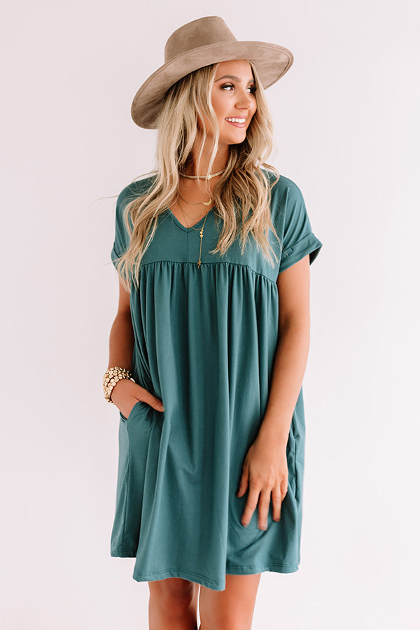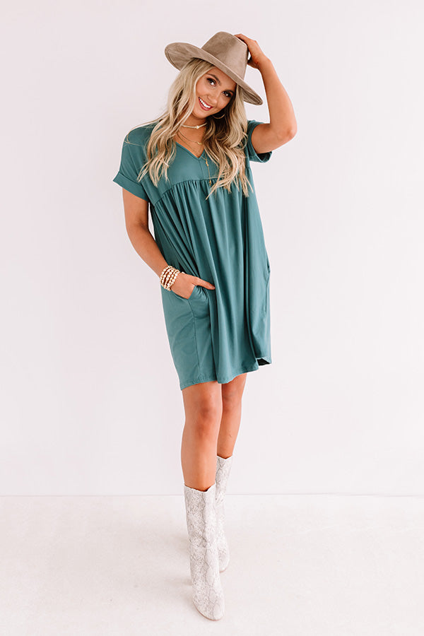 Our darling hunter green "Holding Hands" dress is a year round fave with its stretchy lightweight material, v-cut neckline, short sleeves with rolled cuffs, hidden side pockets, and relaxed babydoll silhouette that falls into a straight mid-thigh length hemline! This transitional piece layers perfectly under a denim jacket with some snake print booties and a neutral faux suede hat for a fall night out look, or it can be worn with "The Jess Faux Leather Heel in Grey" and our "New On The Block Faux Leather Fringe Tote in Grey!"