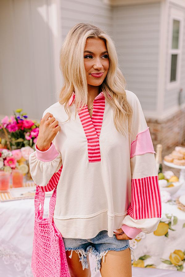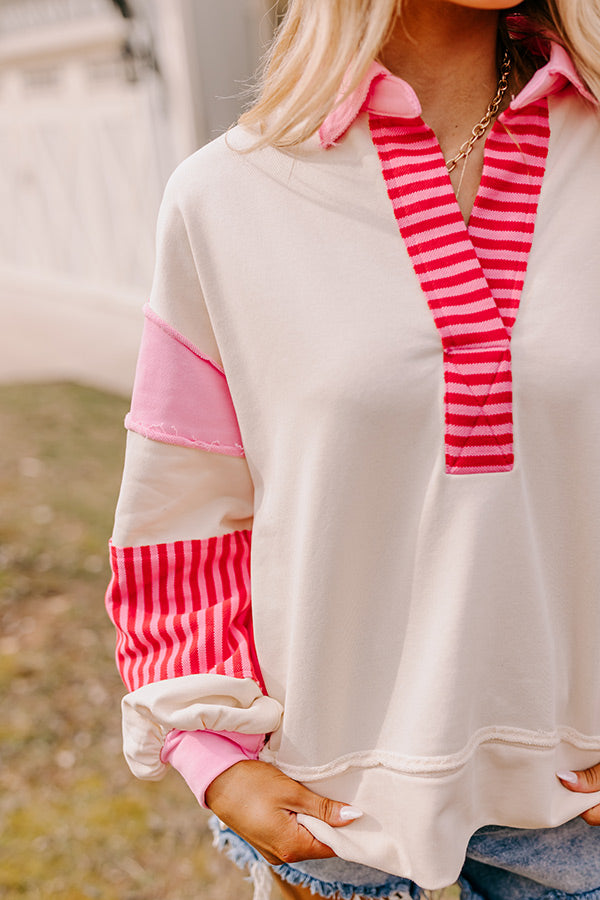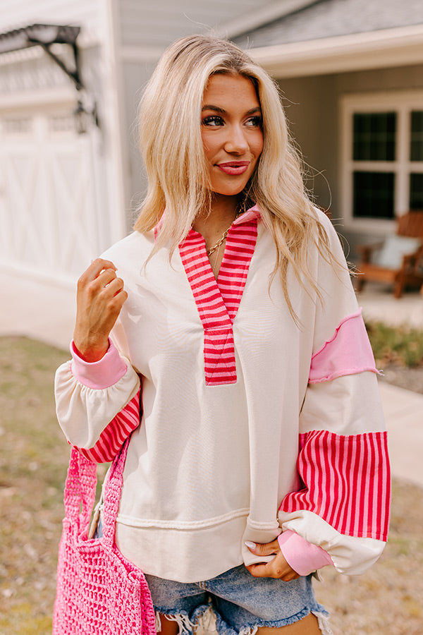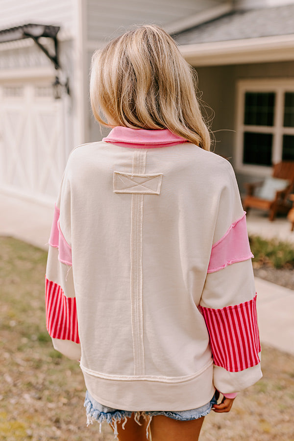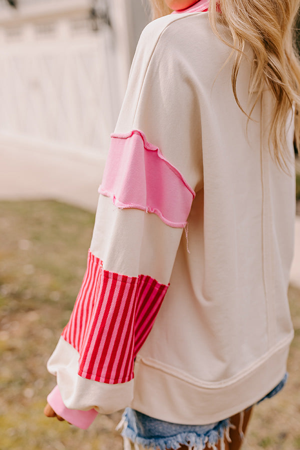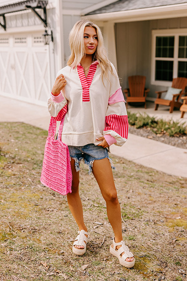 - Unlined material with pink as well as striped pink and red hued accent patches