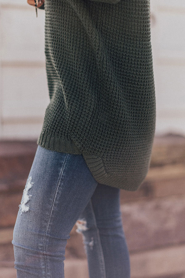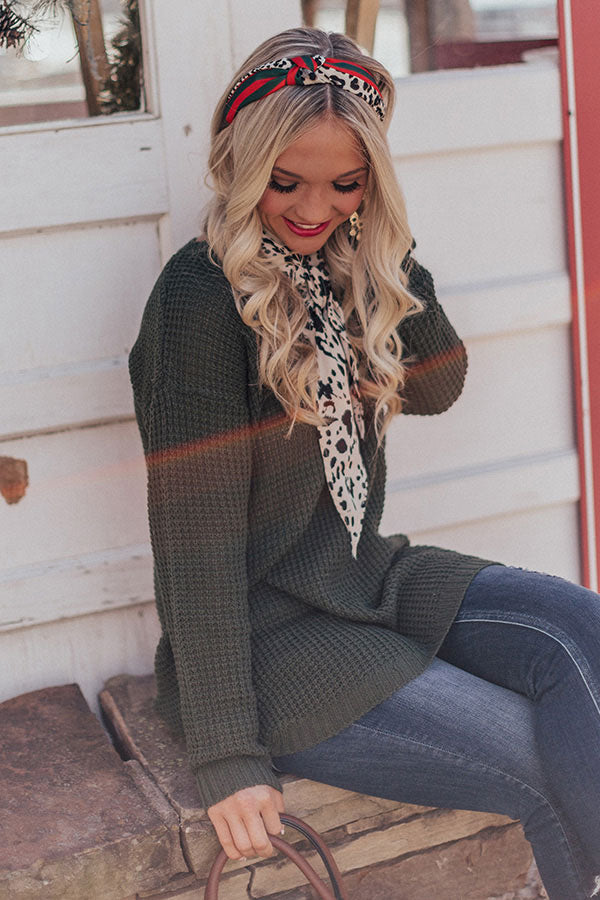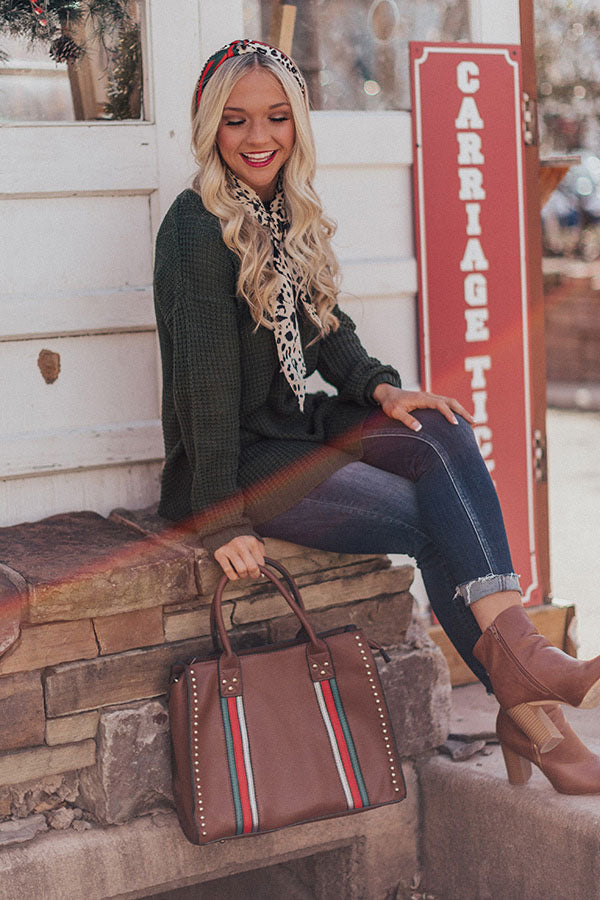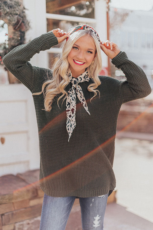 There is no better way to start getting those "holiday feels" than by wearing this adorable hunter green sweater featuring lightweight tight knit material with ribbed texturing, a high rounded neckline, long loose sleeves with fitted cuffs, and a relaxed silhouette that falls into a straight hemline! We have styled this festive cold weather piece with some distressed ankle skinnies, a matching hair and neck scarf, and a neutral bootie and tote, but you can also wear it under an ivory cardigan with some charcoal flares and "The Seraphina Faux Leather Wedge in Grey!" Measurements