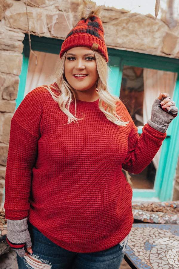 Plus Size - There is no better way to start getting those "holiday feels" than by wearing this adorable red sweater featuring lightweight tight knit material with ribbed texturing, a high rounded neckline, long loose sleeves with fitted cuffs, and a relaxed silhouette that falls into a straight hemline! We have styled this festive cold weather piece under a flannel with some distressed ankle skinnies, a matching glove set and beanie, and a black bootie and backpack, but you can also wear it with some charcoal flares and "The Seraphina Faux Leather Wedge in Grey!" Measurements
