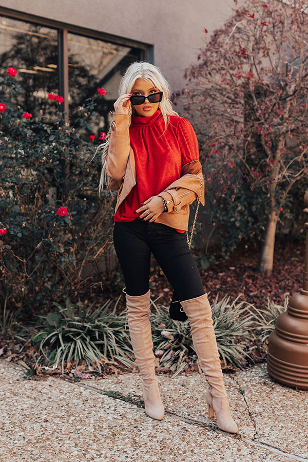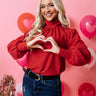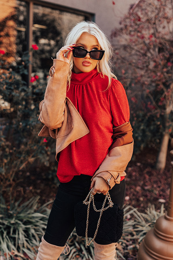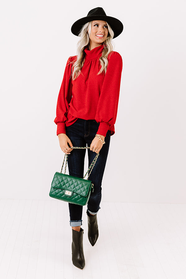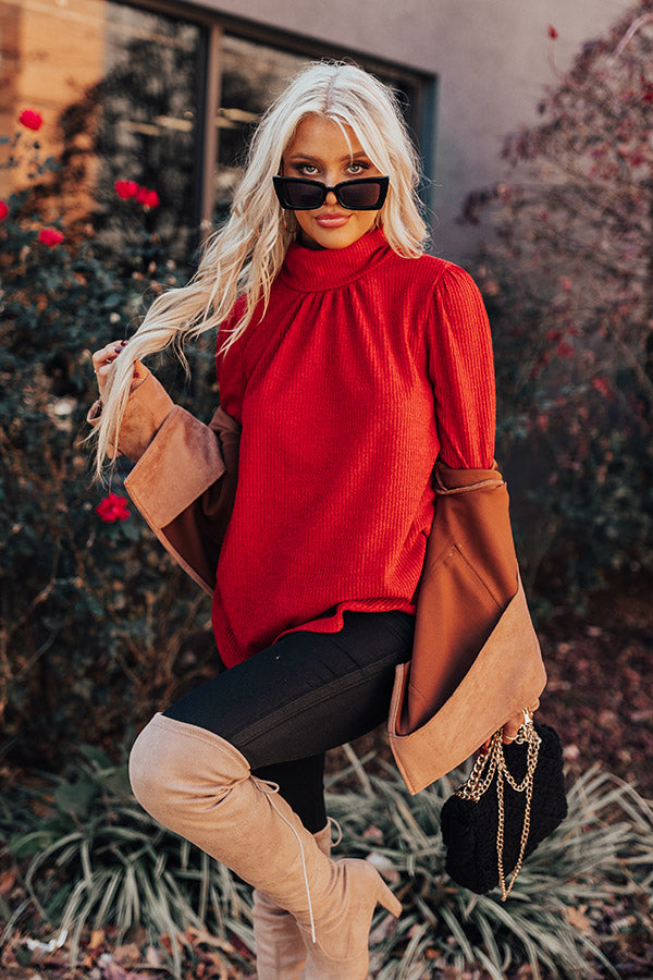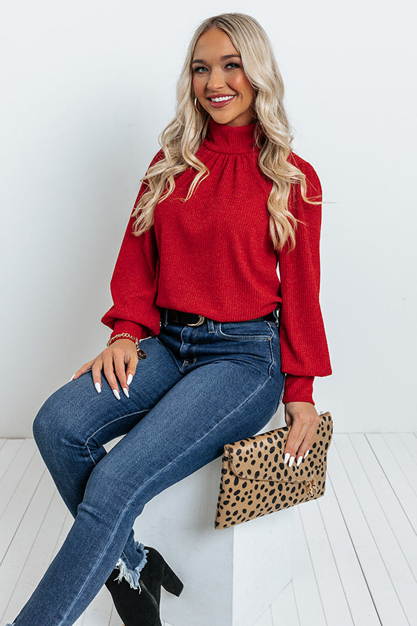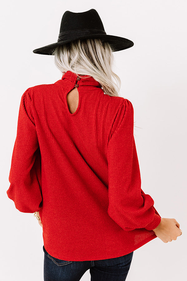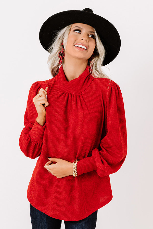Spread some holiday happiness with this festive red top featuring soft lightweight tight knit material with subtle ribbed texturing, a turtle neckline, long bishop sleeves with fitted cuffs, a keyhole accented upper back with a button closure, and a relaxed silhouette that falls into a rounded hemline!