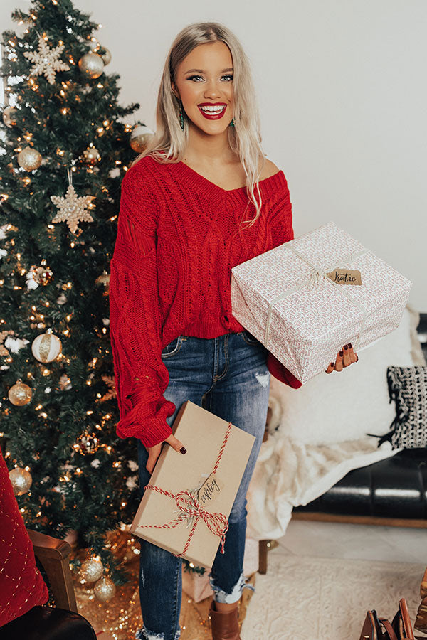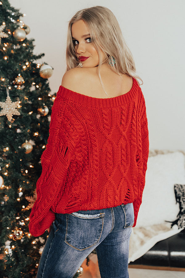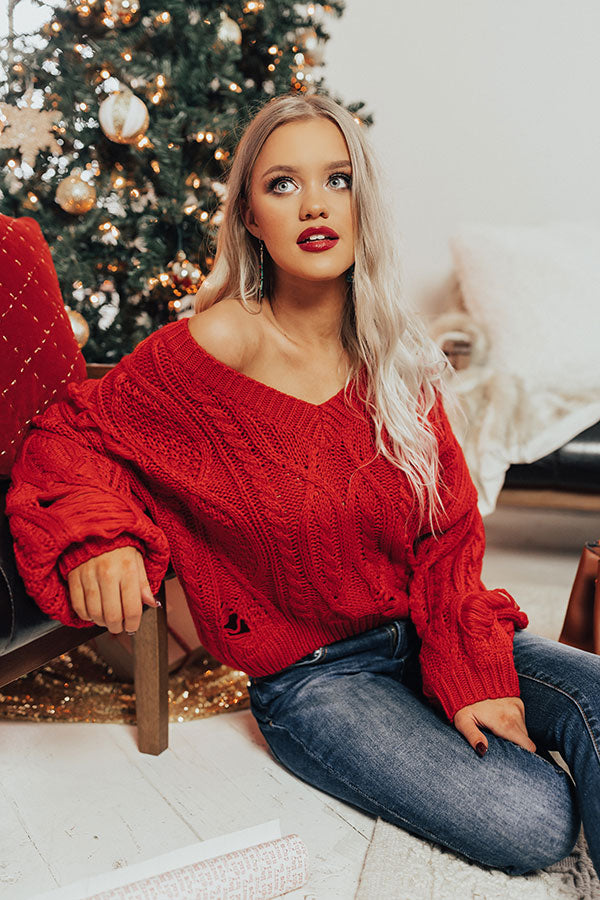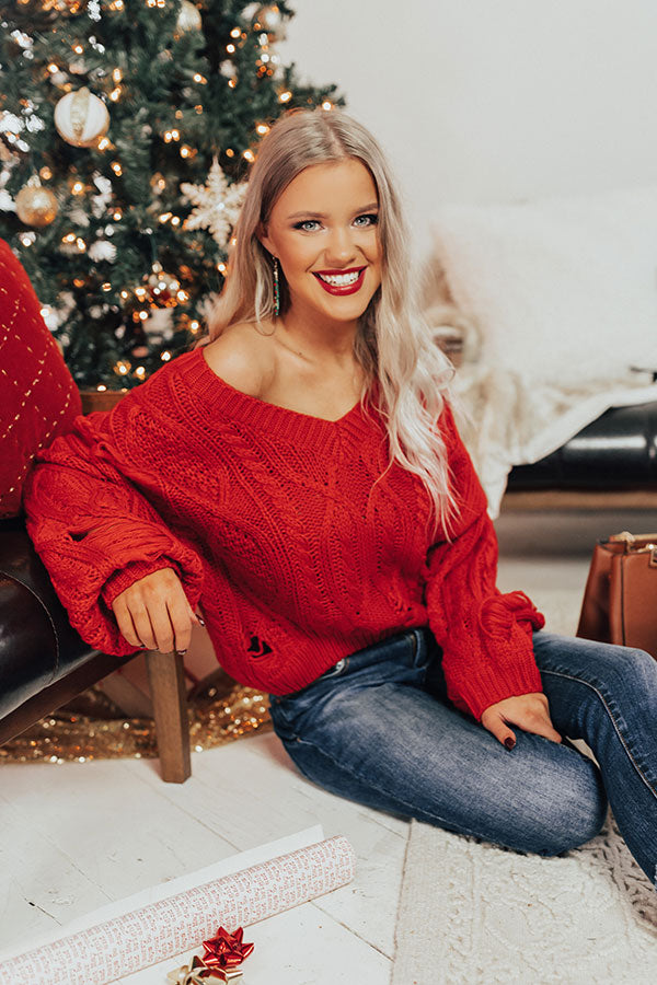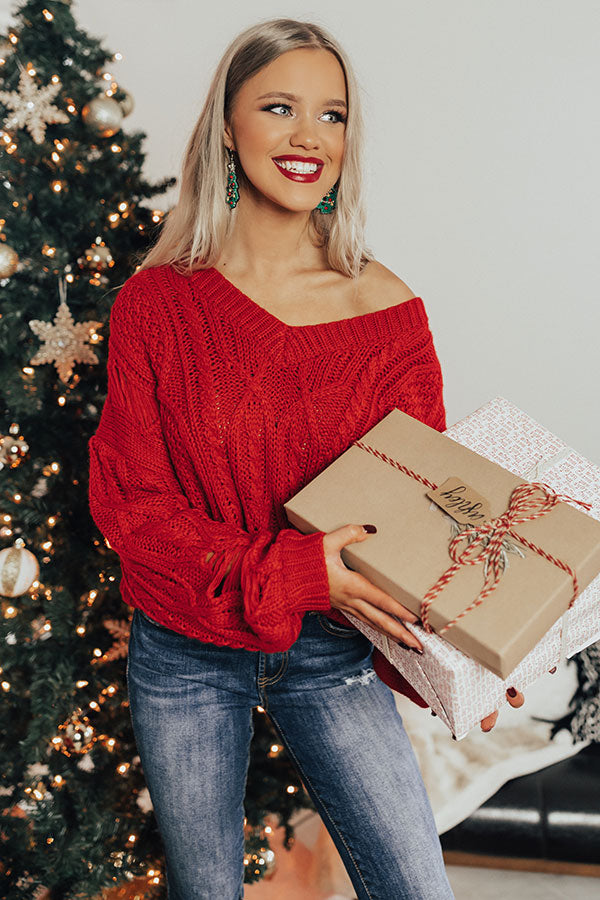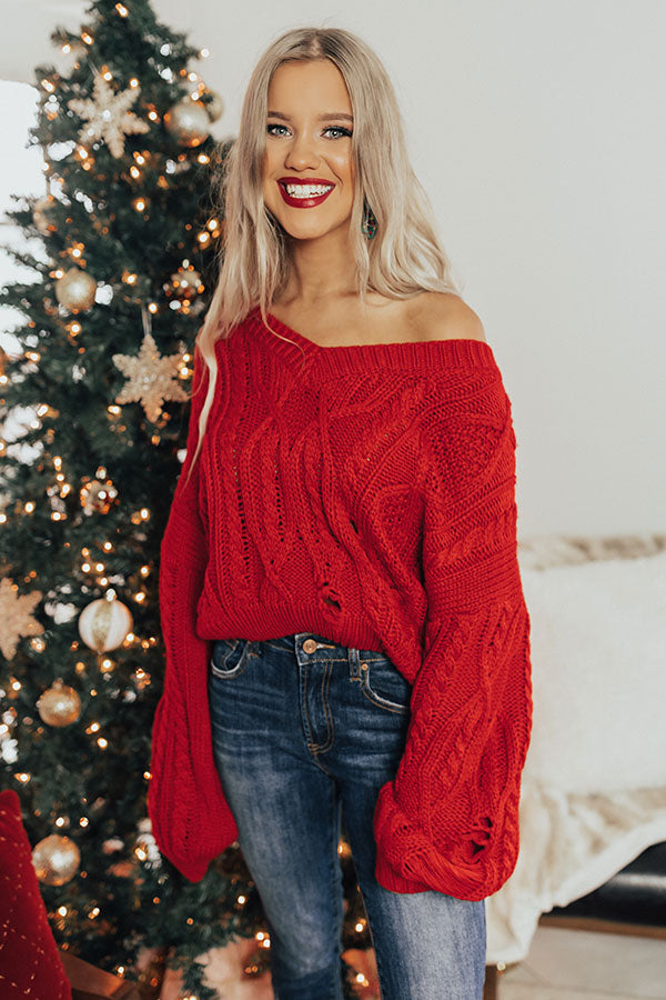 Channel all the "holiday vibes" with this chunky and cozy red sweater featuring soft lightweight tight knit material with wide braided and twisted texturing, subtle distressed detailing, a wide v-cut neckline that can be worn off one shoulder, long oversized sleeves with fitted cuffs, and a relaxed silhouette that falls into a straight hemline! This traditional Christmas piece styles PERFECTLY with some frayed ankle skinnies and neutral booties, or it can be worn with some charcoal flares, "The Seraphina Faux Leather Wedge in Grey," and a grey tote and faux suede hat! Measurements