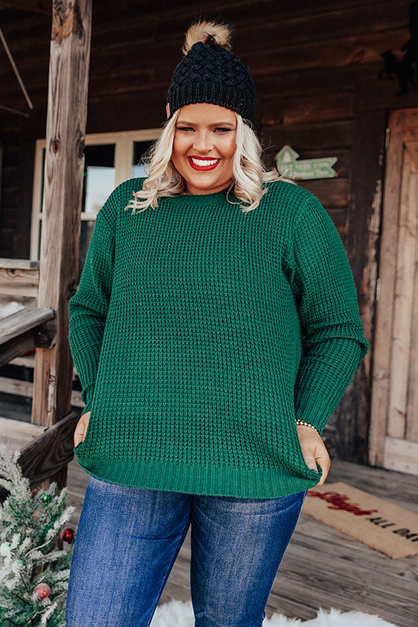 Plus Size - Have a holly jolly Christmas with this adorable green sweater featuring soft lightweight but warm material with waffle knit texturing, long loose sleeves with fitted cuffs, a high rounded neckline, and a relaxed silhouette that ends in a straight hemline! Measurements