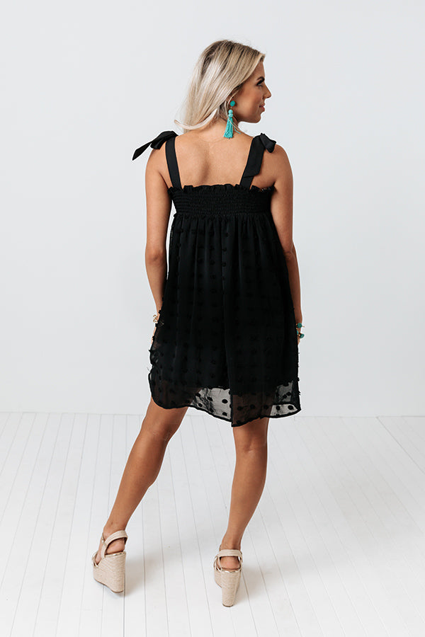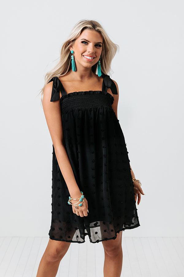 All eyes are sure to be on you in our chic black 'Hollywood Affair Shift Dress' featuring lightweight flowy material patterned with knit polka dot texturing, a square neckline and upper back with ruffled trim detailing, sleeveless tie closure shoulder straps, and a relaxed silhouette that falls into a straight mid-thigh length hemline! Measurements