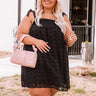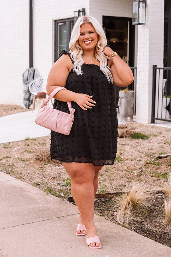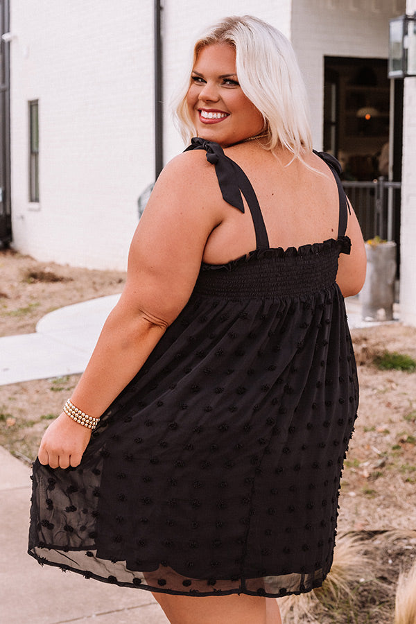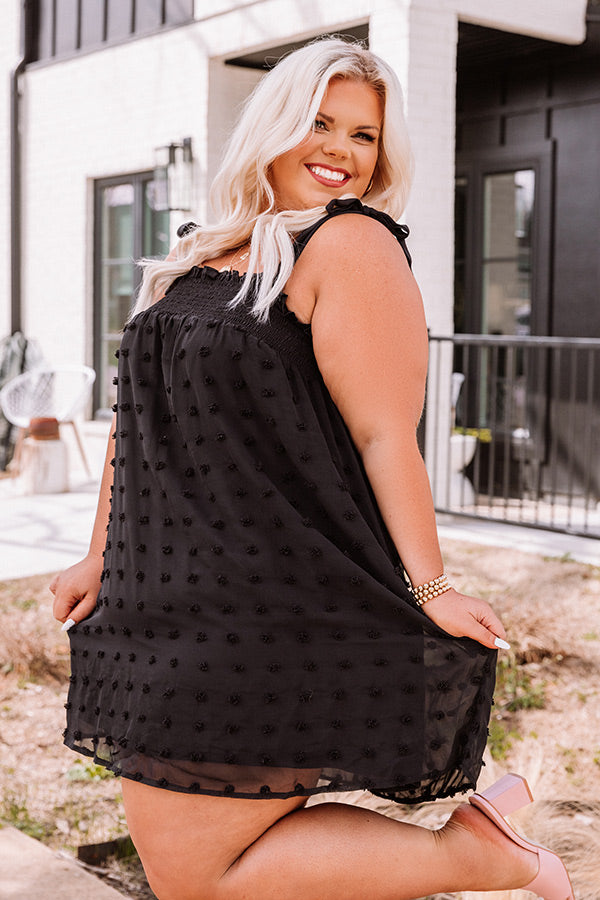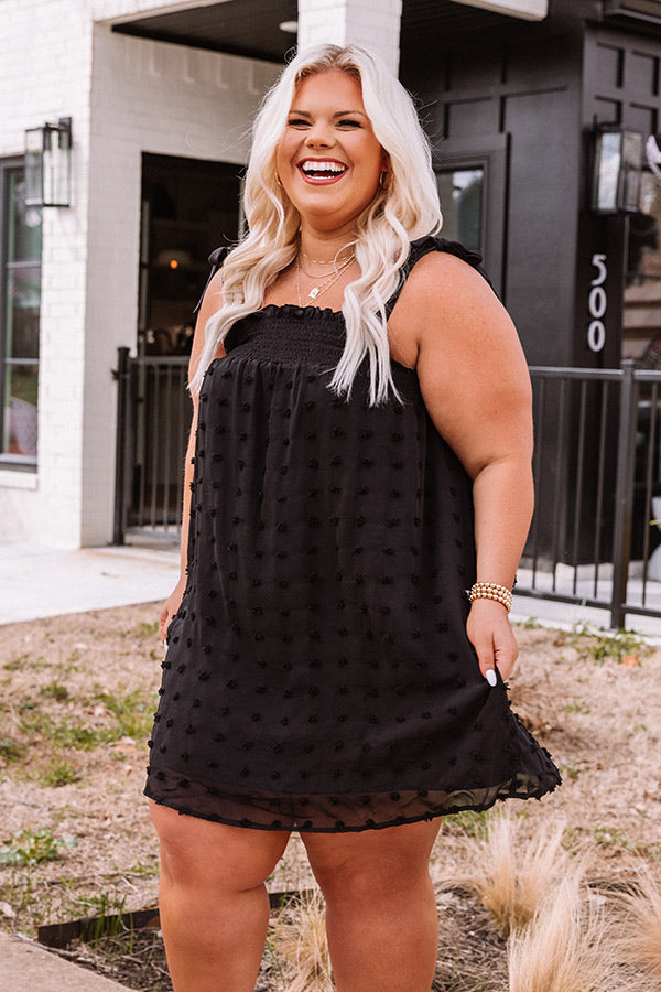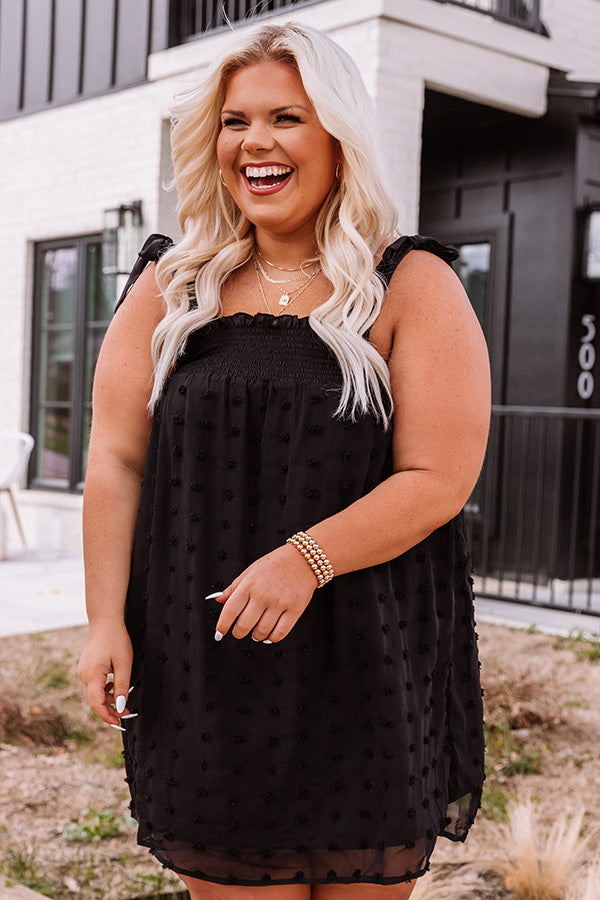 Plus Size - All eyes are sure to be on you in our chic black 'Hollywood Affair Shift Dress' featuring lightweight flowy material patterned with knit polka dot texturing, a square neckline and upper back with ruffled trim detailing, sleeveless tie closure shoulder straps, and a relaxed silhouette that falls into a straight mid-thigh length hemline! Measurements