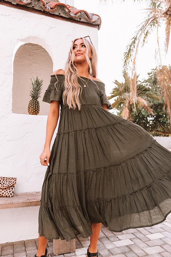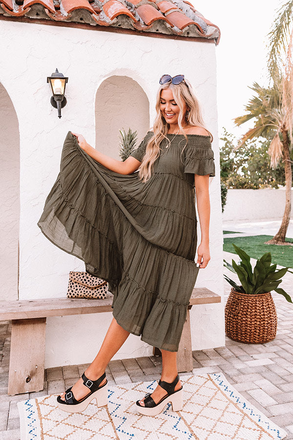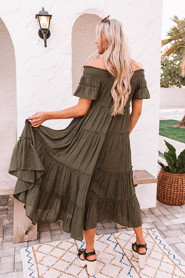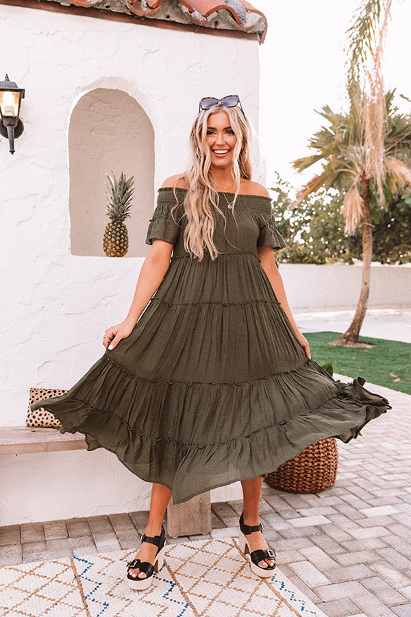 Dress to impress in our stunning olive colored photo-worthy 'Hollywood Bungalow Midi Dress' featuring lightweight breezy material, a wide smocked off-shoulder fit with a straight neckline, short drop sleeves with flared cuffs, ruffled trim and accent seams, and a relaxed but flattering tiered silhouette that cascades into an uneven mid-calf length hemline!