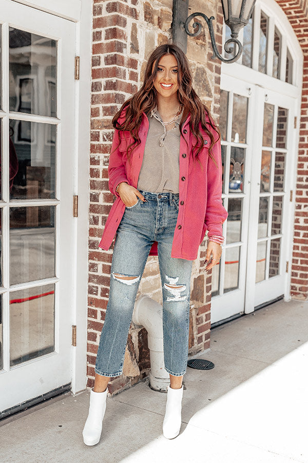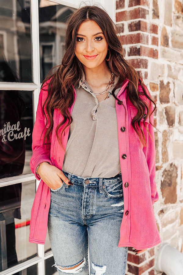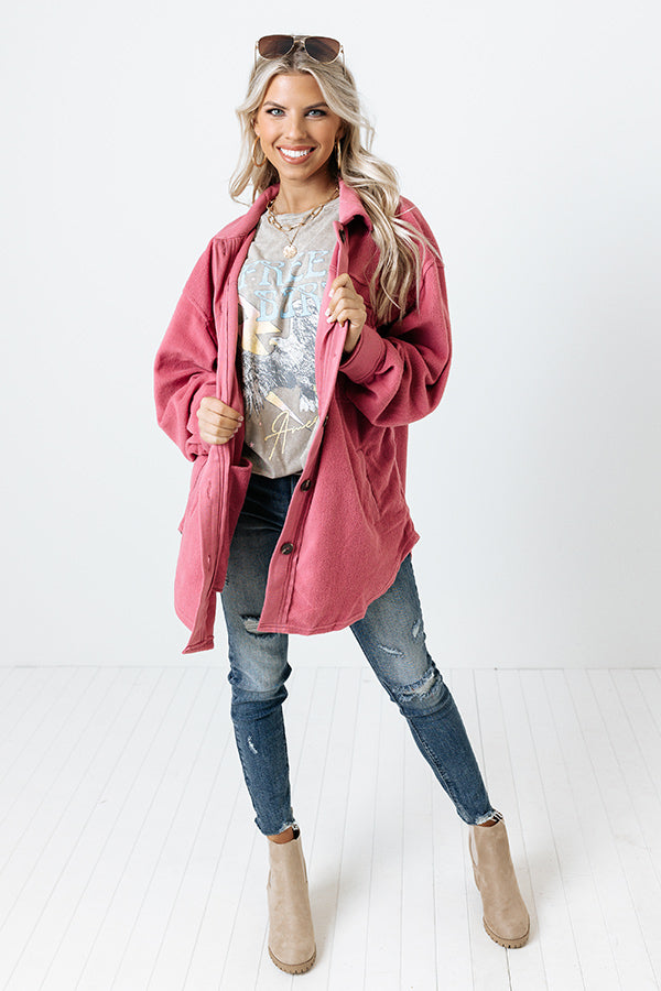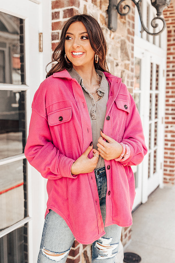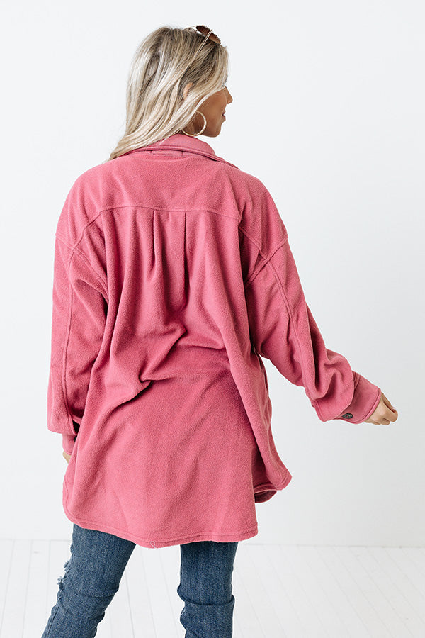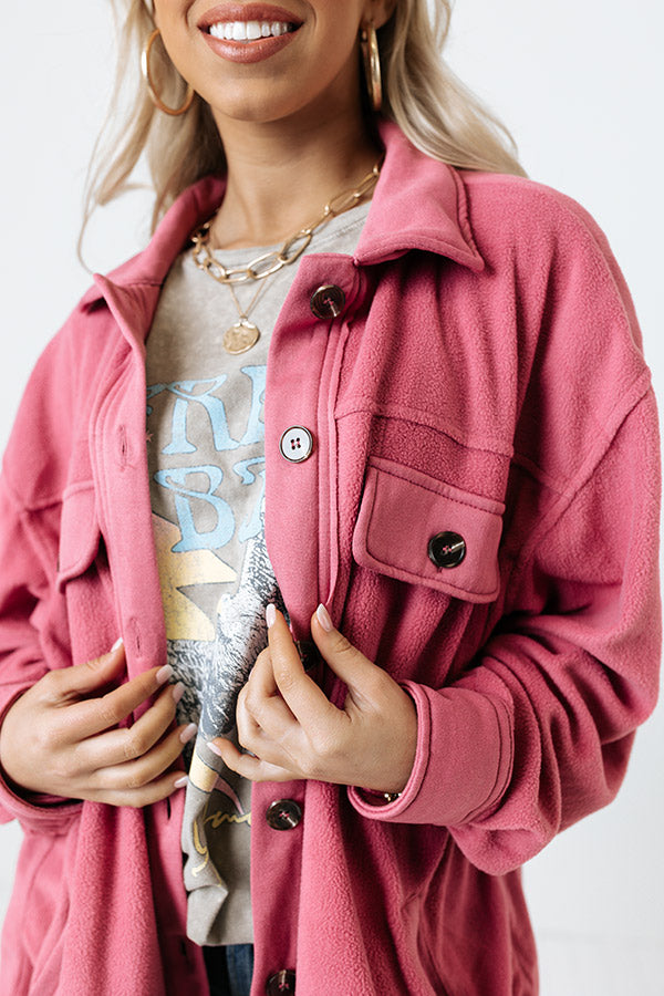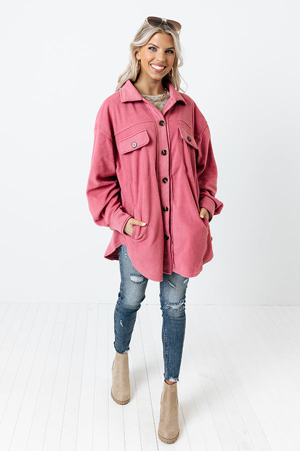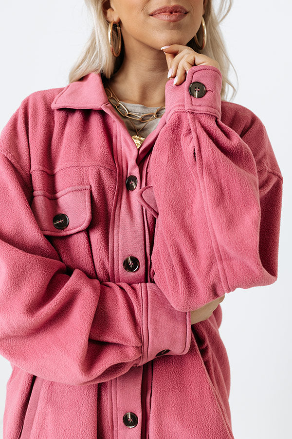 Snuggle up in this trendy blush hued jacket featuring soft and warm material, a button down front with a collared neckline, long loose sleeves with button closure cuffs, two side pockets and two chest pockets with flap closures, and a relaxed silhouette that falls into a rounded hemline!