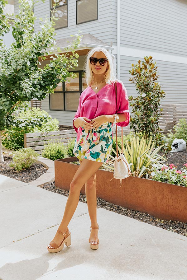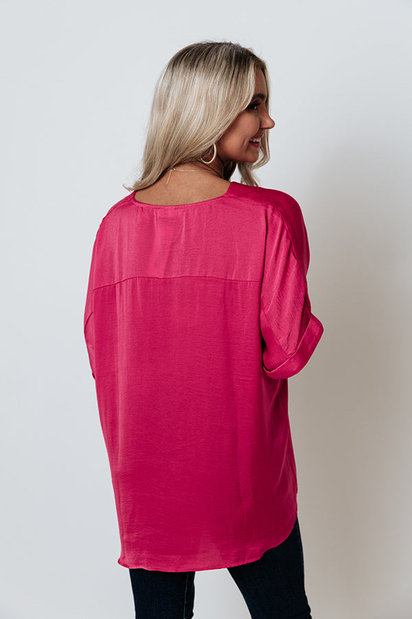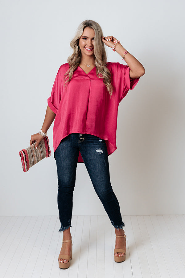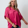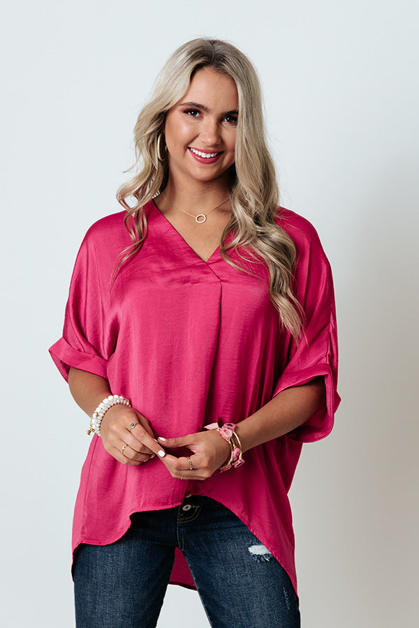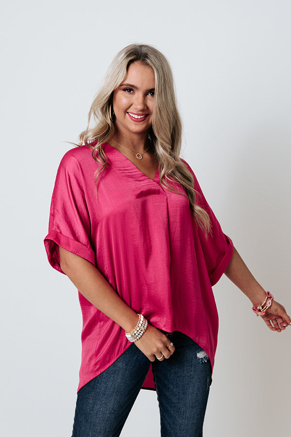 You will look so sweet in this chic rose colored shift top featuring lightweight and breezy satin material, a v-cut neckline, short loose sleeves with rolled cuffs, and a draped silhouette that falls into a rounded tunic-length hemline!