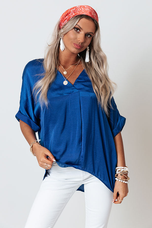 You will look so sweet in this chic royal blue shift top featuring lightweight and breezy satin material, a v-cut neckline, short loose sleeves with rolled cuffs, and a draped silhouette that falls into a rounded tunic-length hemline! Measurements